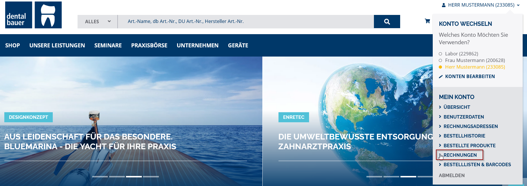 Wenn Sie ein Duplikat einer Rechnung benötigen, können Sie diese in Ihrem Kundenkonto ganz einfach abrufen. Sie finden Ihre Rechungen entweder über die Bestellungen oder über den Punkt "Rechungen" im Schnellzugriff des Kundenkonto-Menüs oben rechts: