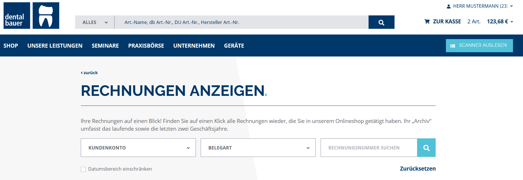 Innerhalb der Rechungen können Sie nach Kundenkonto und/oder Belegart filtern — Sie finden dort also auch Gutschriften oder Stornos. Und Sie können nach einer bestimmten Rechungsnummer suchen.