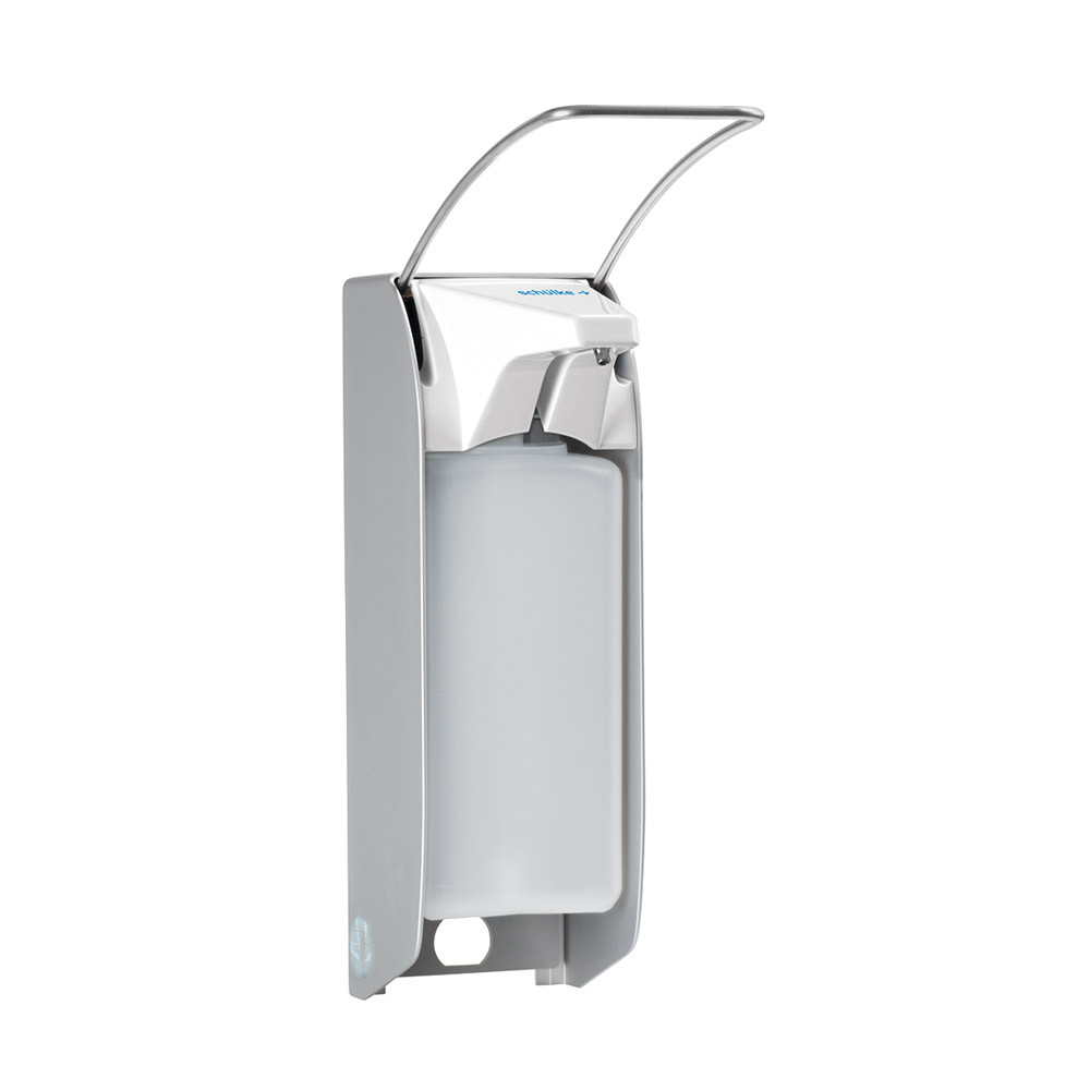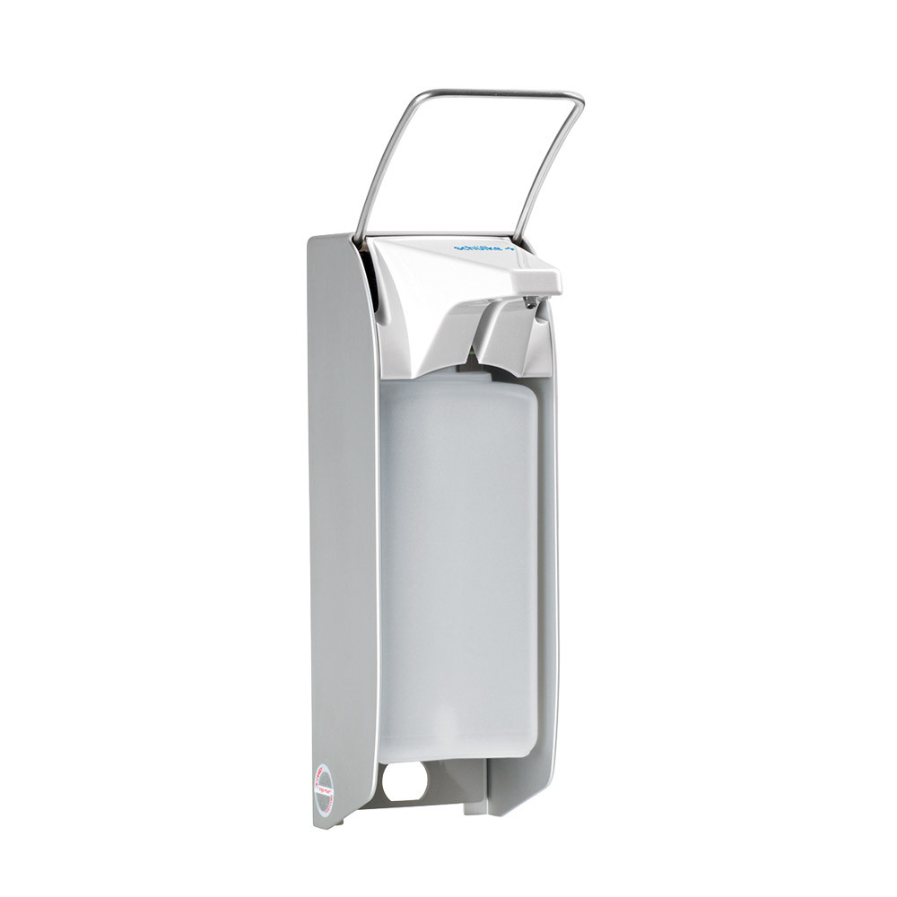 Für die Applikation von Händedesinfektionsmitteln, Wasch- und Pflegelotionen für Einwegflaschen. Mit wahlweise langem oder kurzem Hebelarm. • verstellbarer Dosierhub von ca. 0,75 ml - ca. 1,5 ml je Hub • einfache und exakte Dosierung von Händedesinfektionsmitteln, Wasch und Pflegepräparaten • die austauschbare Pumpe aus Edelstahl sichert störungsfreien Präparatefluss. Kein Verstopfen, Verkleben oder Nachtropfen • bei Bedarf kann der Spender von der Wandbefestigungsplatte abgenommen werden • Gehäuse aus mattsilber aloxiertem Aluminium, eloxiert (wirkt bakterostatisch) , Armhebel aus Edelstahl • für alle marktgängigen Flaschen