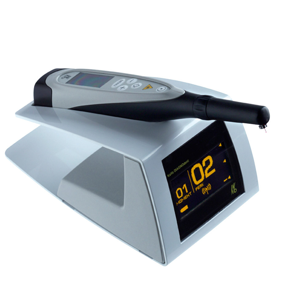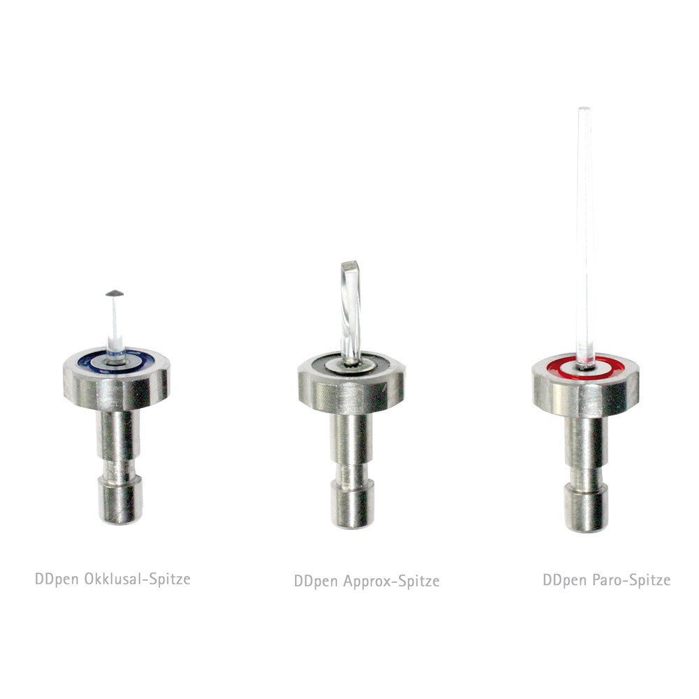 Zum Aufspüren von Approximal-, Fissuren- und Glattflächenkaries als auch Konkremente in Parodontaltaschen. Kleines, kompaktes und kabelloses Handstück, das sowohl über eine akustische als auch digitale Anzeige verfügt. Mit den Saphir-Sonden kann Karies nun auch im Approximalraum erkannt werden, indem der Zahn durch eine Ablenkung des Laserstrahls von 100° C um die Kontaktfläche herum abgescannt wird. Die vorliegenden Studienergebnisse zeigen eine hohe Spezifität und Sensitivität. Zusätzlich zur Kariesdetektion wird der DIAGNOdent pen mit einer speziellen Sonde zur Konkrementdetektion in Paro-Taschen eingesetzt. Die Sonde ermöglicht in einem Arbeitsgang die Messung der Taschentiefe und Überprüfung der Sauberkeit der Tasche.