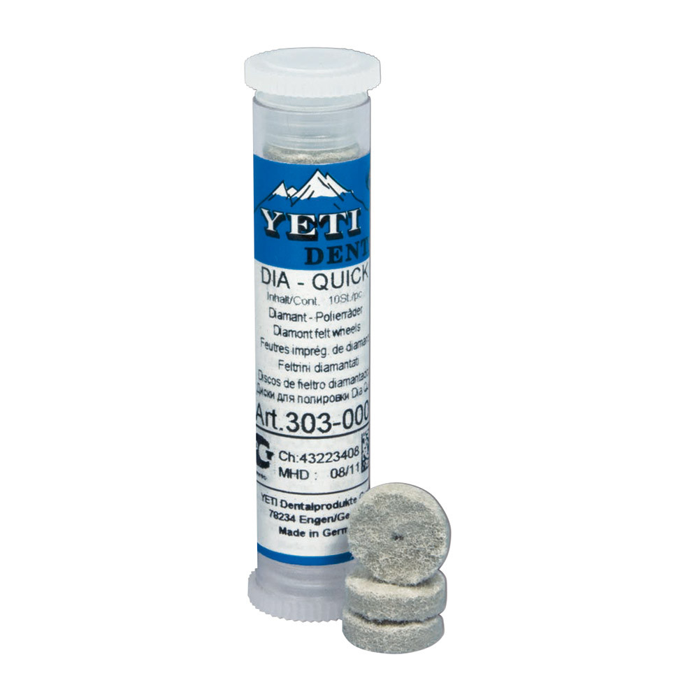 Diamantimprägnierte Filzräder. Die Imprägnierung entspricht der hohen Qualität des DIA GLACE, wobei eine Trägerflüssigkeit das Austrocknen der Filzräder verhindert. Zur schnellen Politur von Keramik, Metall und Kunststoff ohne auf bewährte Qualität zu verzichten.
