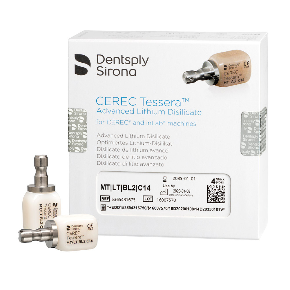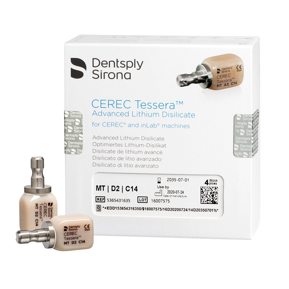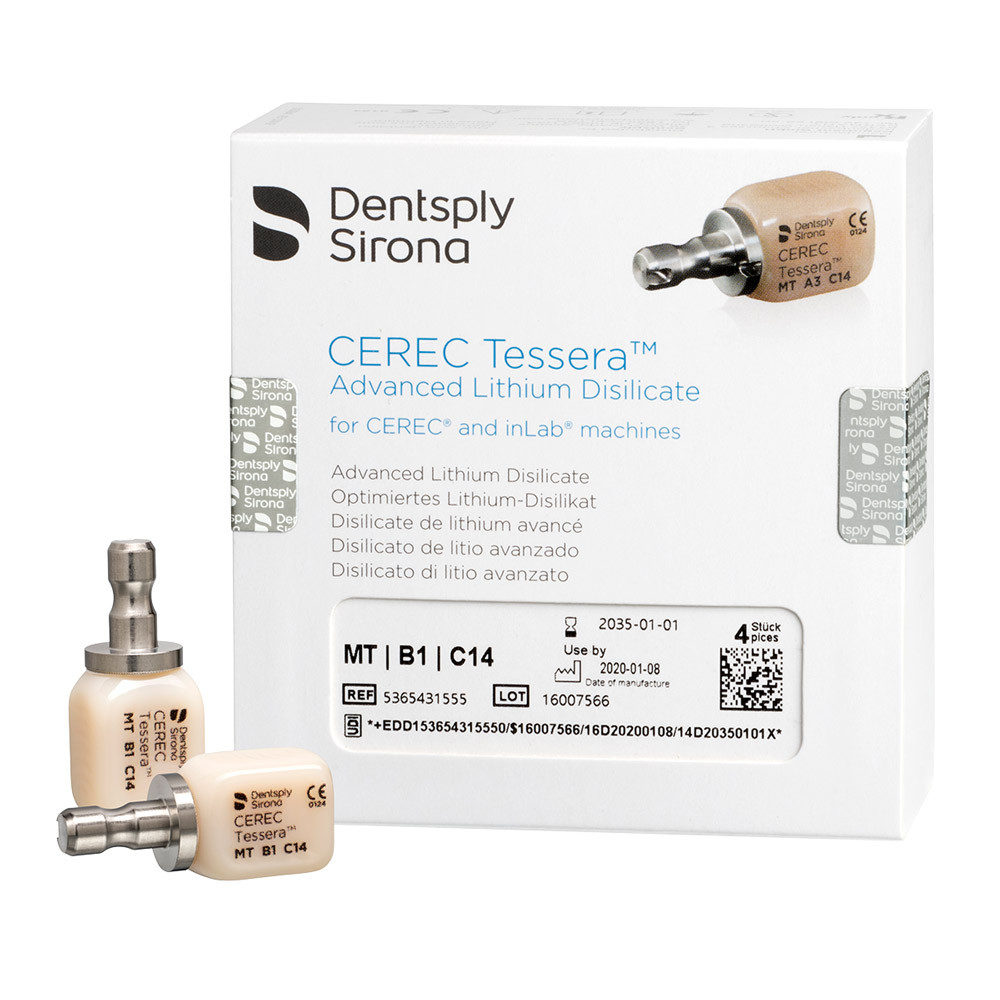 CEREC Tessera, Advanced Lithium Disilicate, ist ein Vollkeramik-System zur Herstellung von Kronen im Front- und Seitenzahnbereich sowie Inlays, Onlays und Veneers. • 700 MPa biaxiale Festigkeit durch Lithium-Disilikat und Virgilit, eingebettet in einer zirkonoxidverstärkten Glasmatrix – bis zu 32% fester als der Wettbewerb. • Hervorragende Transluzenz-, Fluoreszenz und Opaleszenz-Eigenschaften – wird selbst hohen Ansprüchen an ästhetischen Restaurationen im direkt sichtbaren Frontzahnbereich gerecht • Bis zu 44% weniger Verarbeitungszeit durch kurzen Glasurbrand von nur 4:30 min im CEREC SpeedFire.