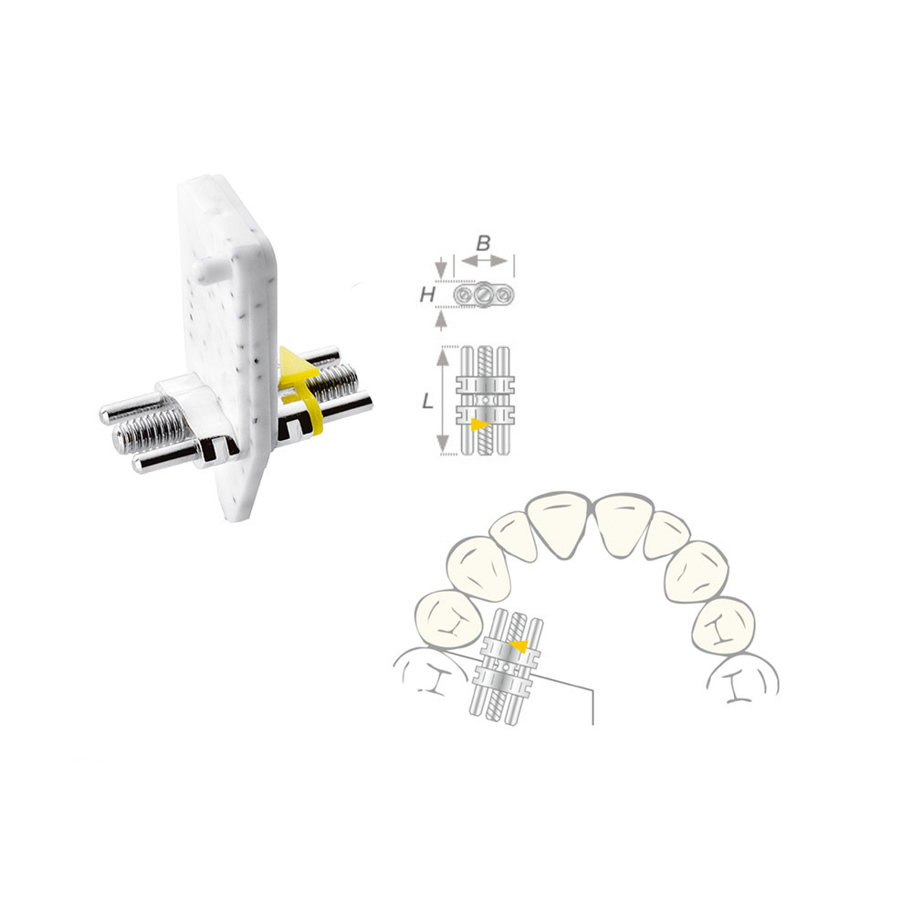 Stabile, skelettierte Dehnschraube mit leuchtgelbem Drehrichtungspfeil für Oberkiefer-Transversaldehnung...