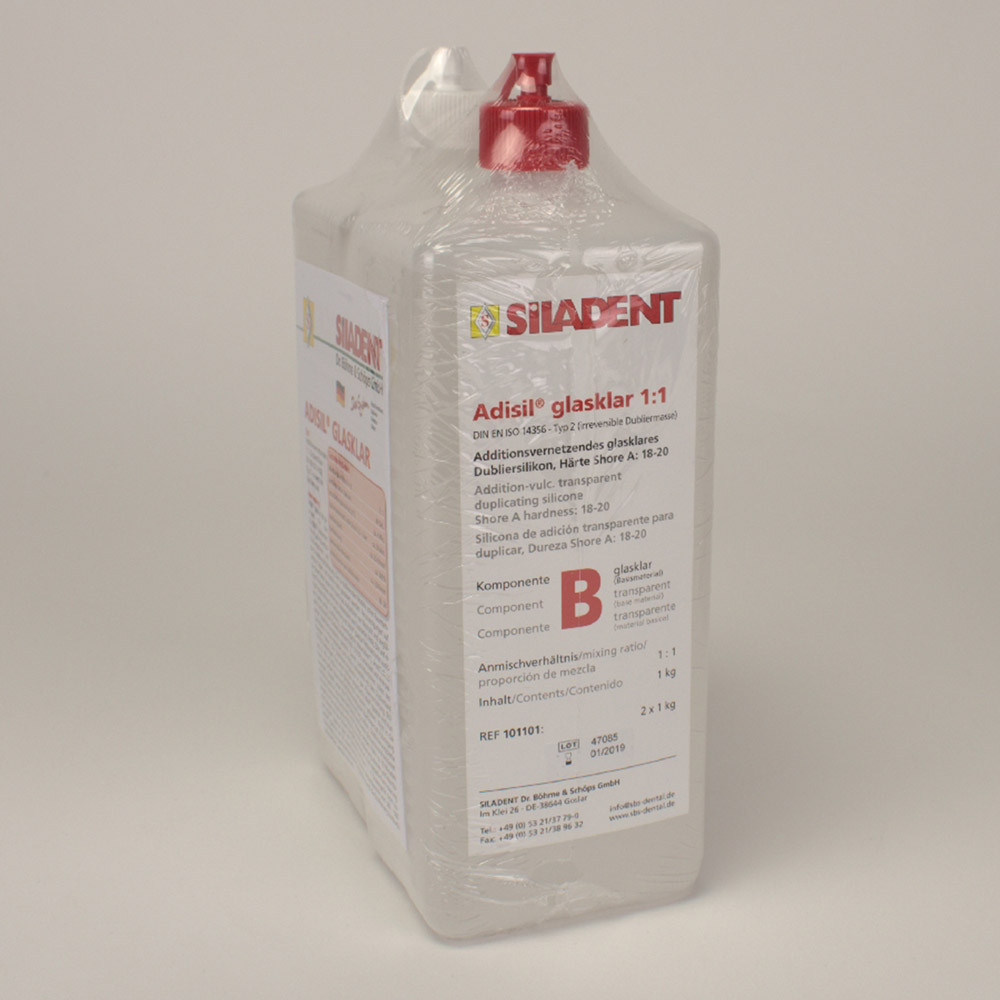 Ein glasklares additionsvernetzendes Dubliersilikon für Einzelstumpfdublierungen. Dosierung 1:1. Lichthärtende Composites mit einer Wellenlänge von 300 und 500 nm lassen sich durch das Silikon hindurch polymerisieren. Gezielter Einsatz in der Kunststoffprothetik.