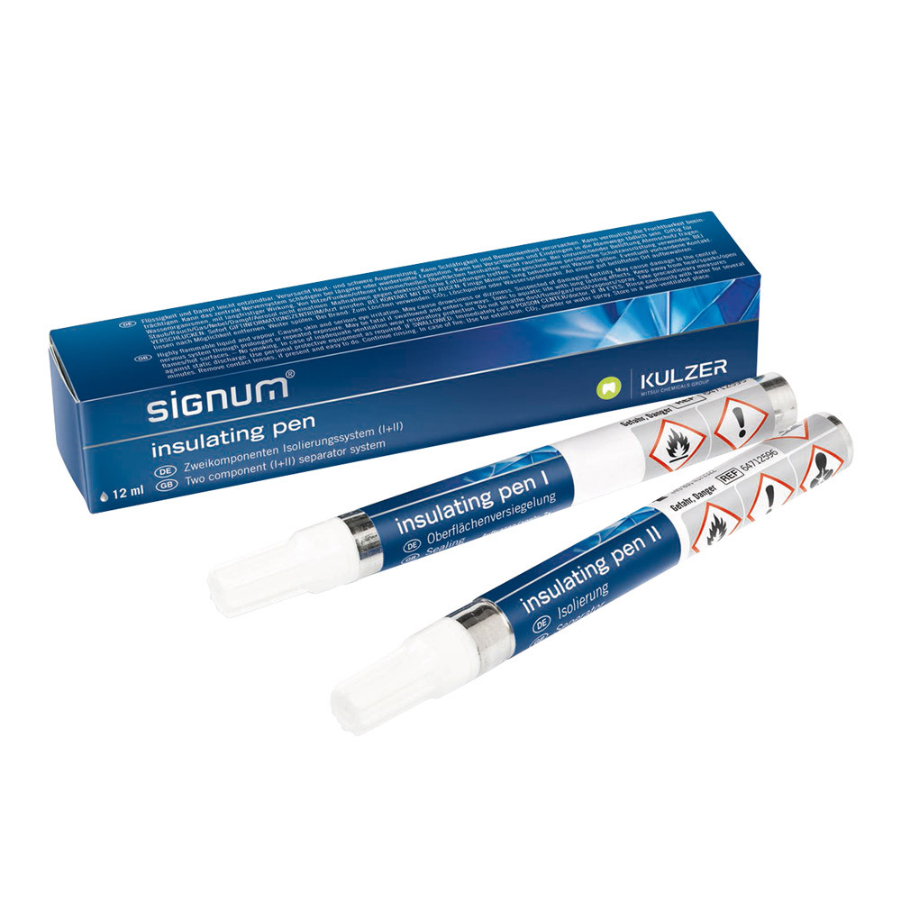 Zweikomponenten-Isolierung zum Separieren von Gips oder Epoxid gegen Signum Verblendkomposite. Signum insulating pen I schließt Mikroporen auf der Gipsoberfläche. Signum insulating pen II bildet einen hauchdünnen Isolierfilm, der höchste Passgenauigkeit ermöglicht.
