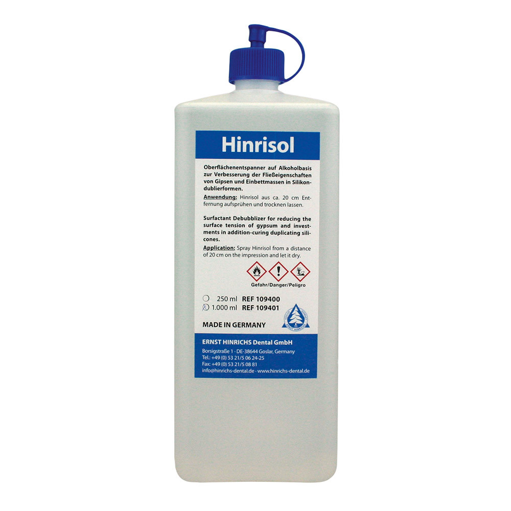 Zum Entspannen, Neutralisieren und Reinigen von Silikon-, Wachs- und Kunststoffoberflächen ohne Schmierbildung. Hinrisol ist mit allen Abdruck- und Dubliermaterialien auf Silikonbasis verträglich.