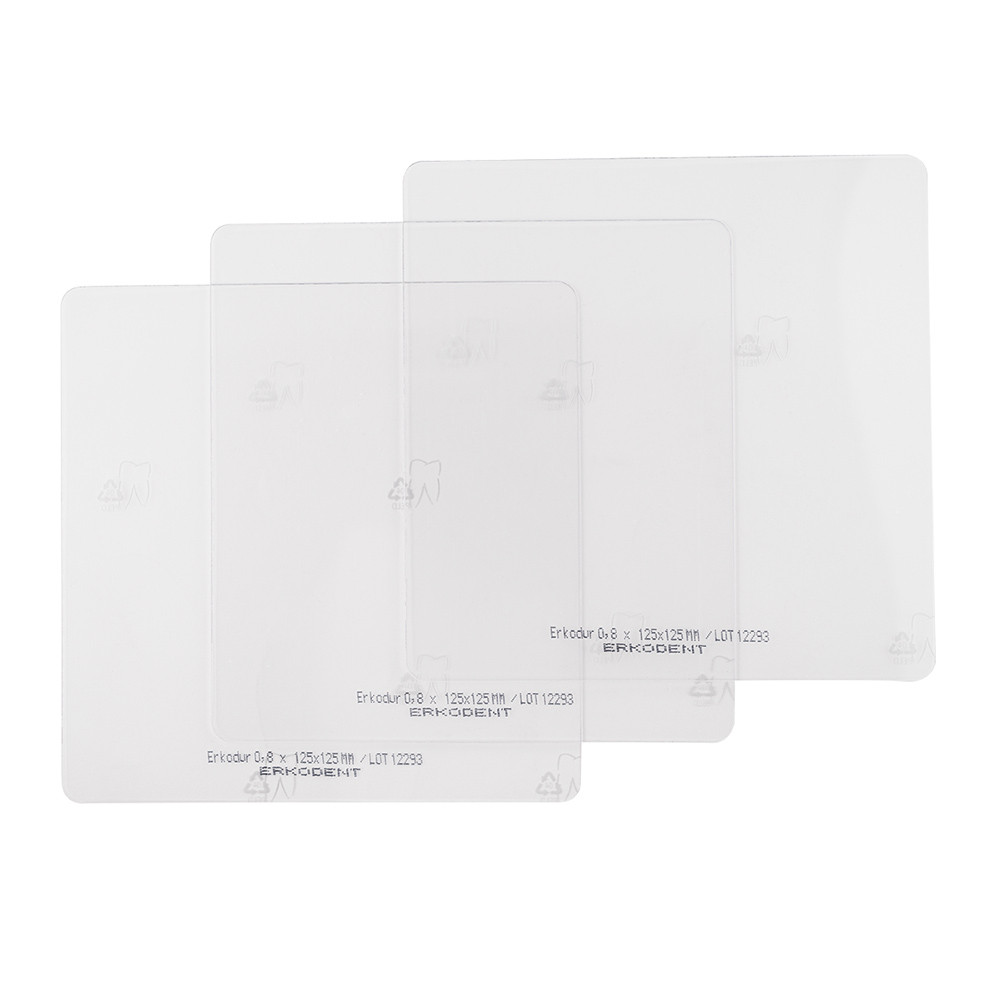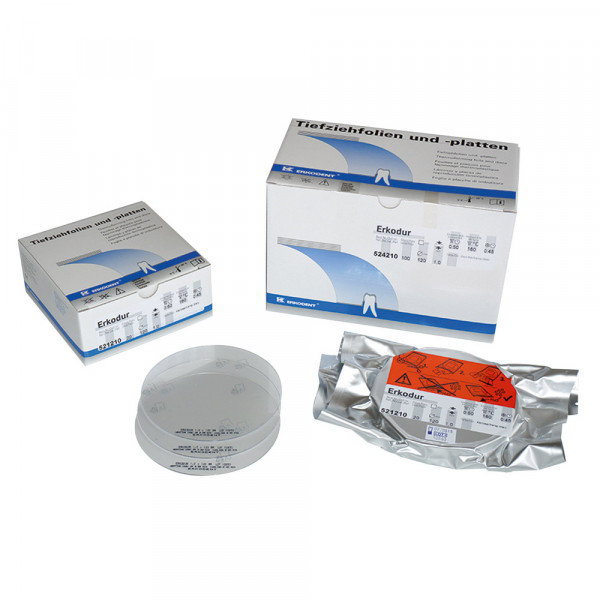Erkodur ist eine zähharte, glasklare Folie. Äußerst schlagzäh. Sehr gut tiefziehbar. Verbindet sich mit Autopolymerisat. Kein Vortrocknen nötig. Mit Unterziehfolie als Schrumpfausgleichs- und Isolierfolie für Aufbiss-, Knirscher-, Stabilisierungs-, Drum- und Miniplastschienen, Verbandplatten, Gussformteilen.