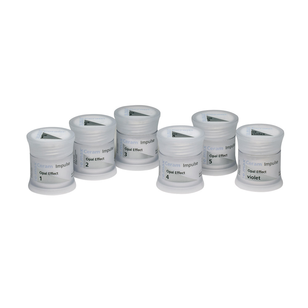 Die Opal Effect-Massen stehen dem Anwender in 6 farblichen Abstufungen zur Verfügung. Beginnend bei Opal Effect 1 - mit natürlicher gesteigerter Opaleszenz bei gleichzeitig hoher Transluzenz - steigert sich der Helligkeitswert zwischen Opal Effect 2 und Opal Effect 4 kontinuierlich. Opal Effect 5 zeigt die typische Opalfarbe. Die Opal Effect-Masse "violet" dient zur Reduzierung des Helligkeitswertes im Inzisalbereich.