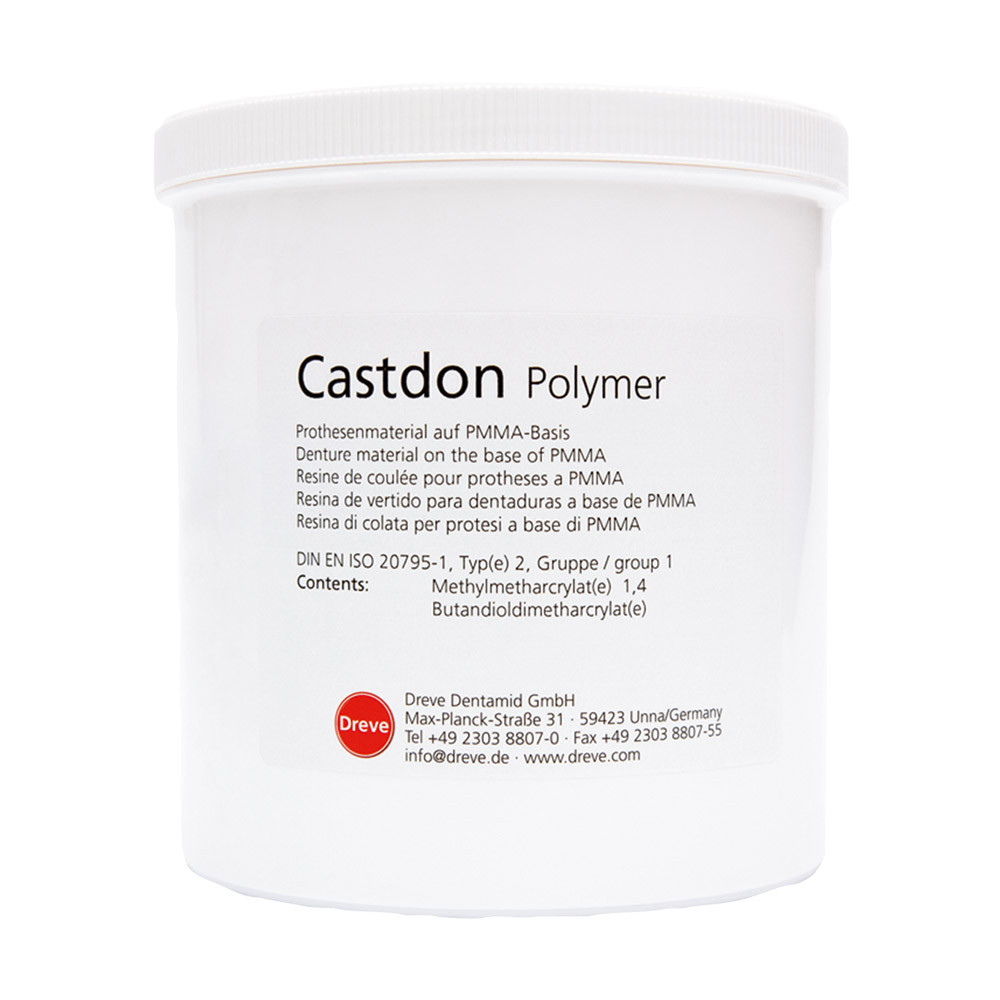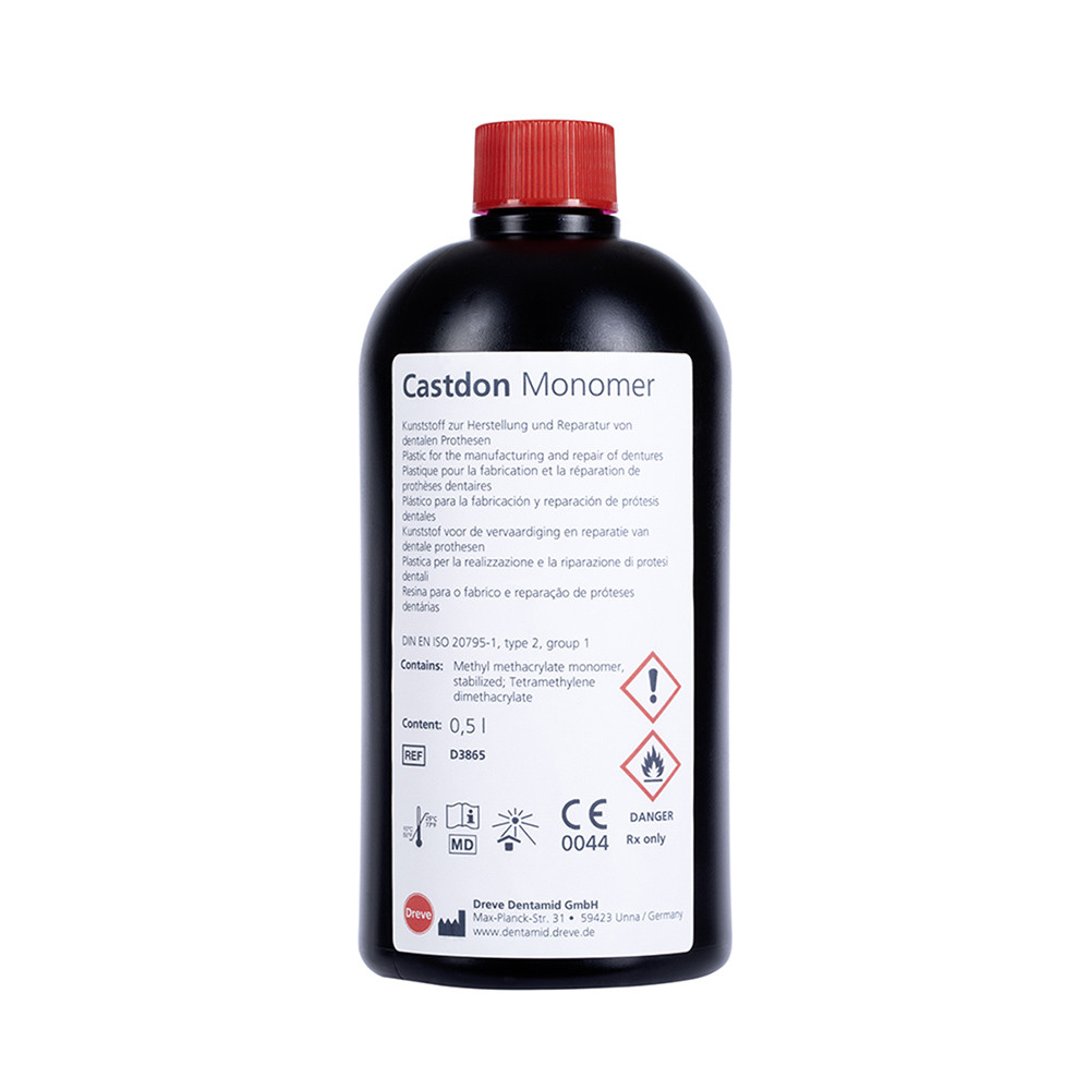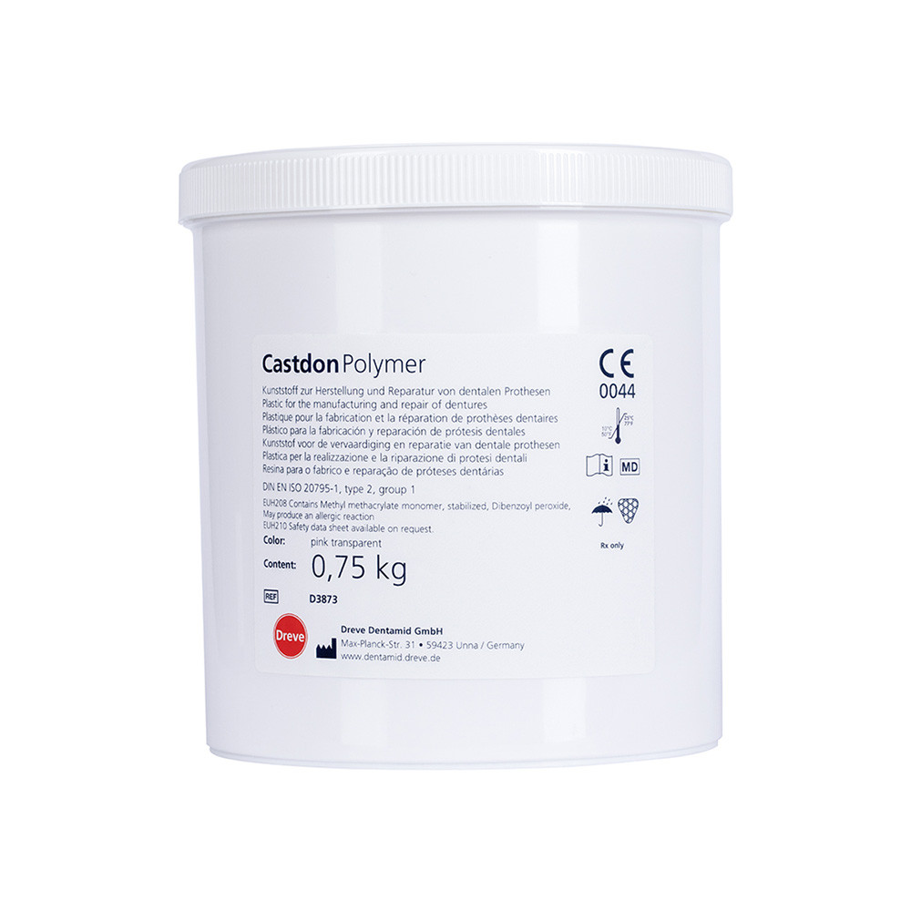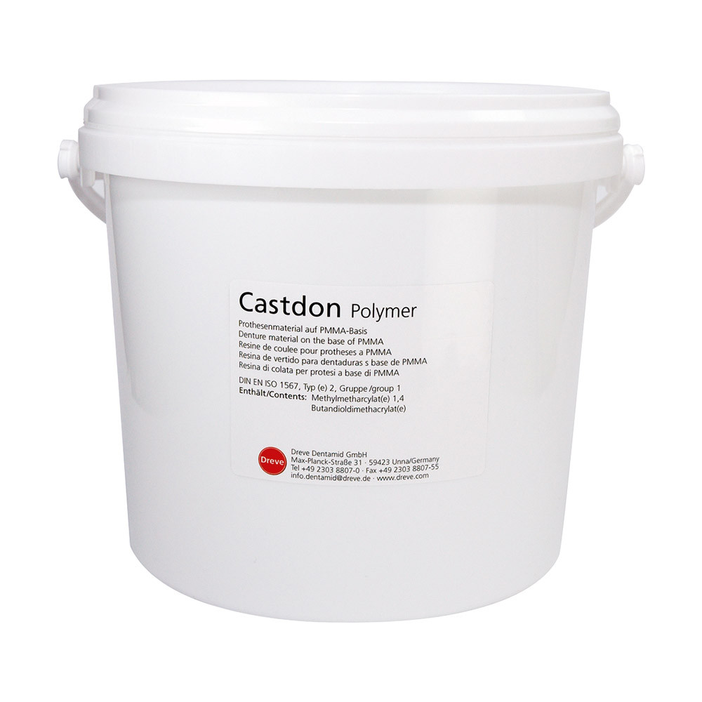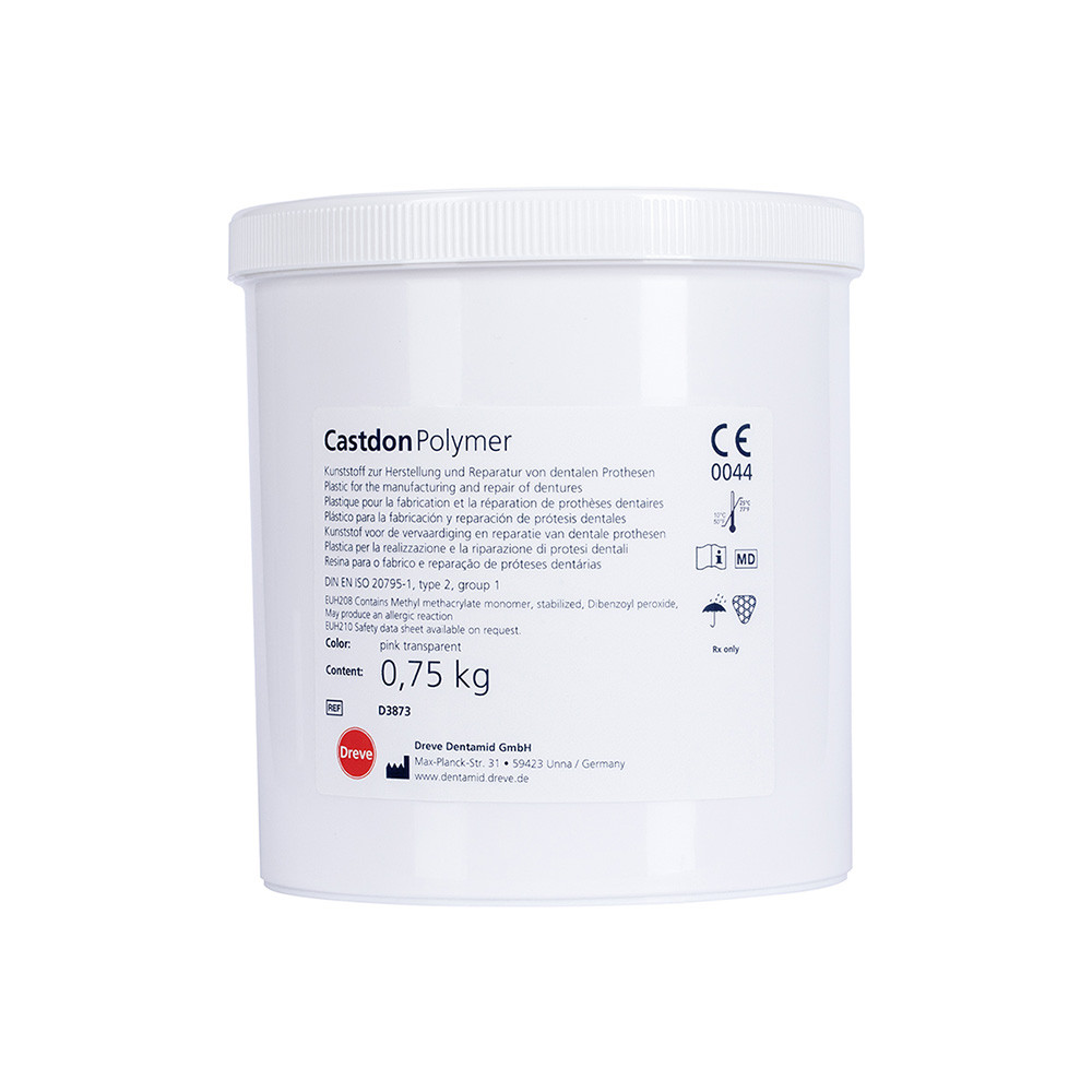 Zeitsparendes, rationelles Prothesengießverfahren. Der cadmiumfreie PMMA-Kunststoff ist bruchstabil und hat sich seit vielen Jahren klinisch bewährt. Durch das Anmischverhältnis von 2:1, wobei CASTDON nach Kühlung immer noch gießfähig ist, wird der Restmonomergehalt minimiert (nach 48 Std. ca. 1 %!). CASTDON ist optimal geeignet für die Herstellung von totalen und partiellen Prothesen im Gießverfahren und darüber hinaus für das Pressverfahren und für Komplettierungen, Unterfütterungen, Reparaturen, Ergänzungen usw.