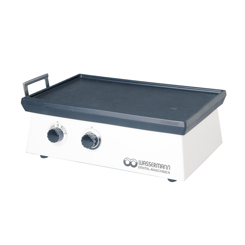 Leistungsstarker Vibrator für Küvetten. Schwingungsintensität stufenlos regelbar und geringe Vibrationsübertragung durch schwingungsdämpfende Kegelfüße. • Extrem schweres und widerstandsfähiges Gussgehäuse • Vollständig kunststoffpulverbeschichtet • Linksseitig mit Bügel zum Ausgießen von Abdrücken • Versenkte Schalterblende