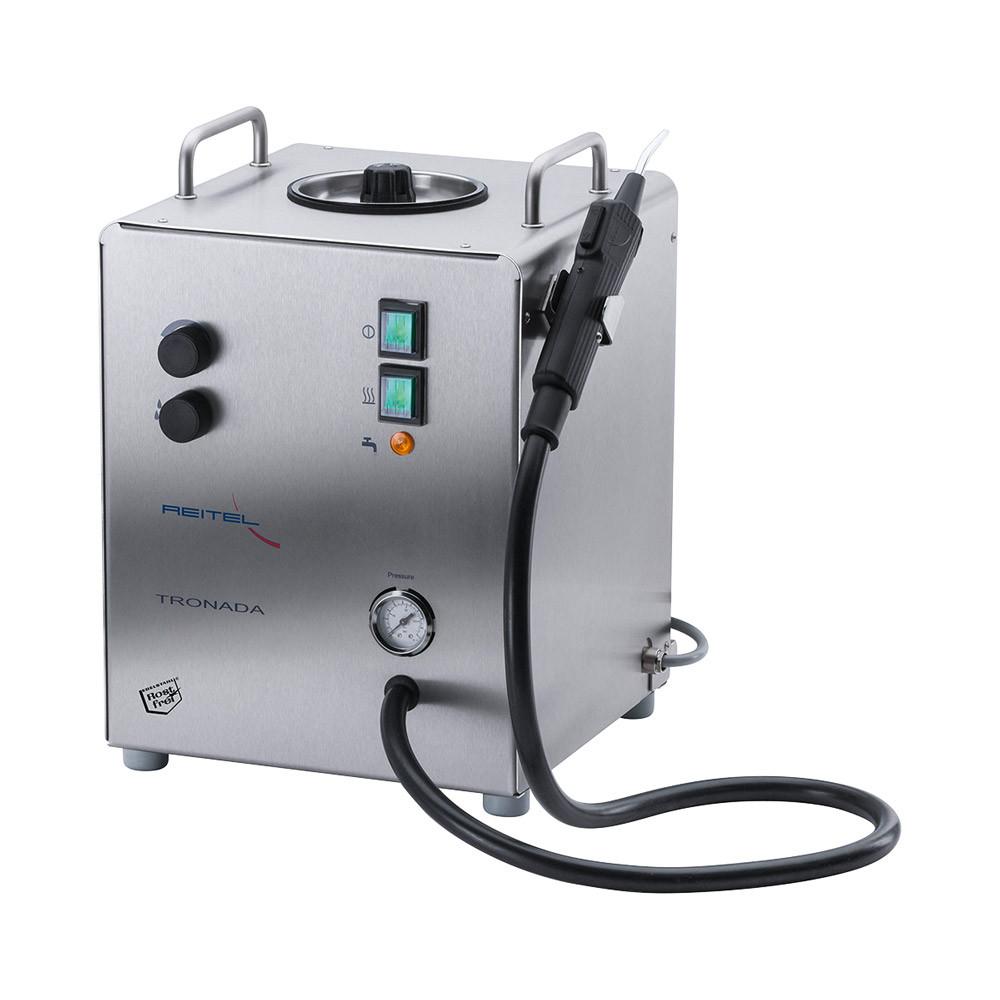 Dampfstrahler zum Reinigen von Kleinteilen, zahntechnischen Arbeiten und Instrumenten, sowie zum punktuellen Einsatz an größeren Objekten. Fette, Klebewachse, Beizmittel, Verschmutzungen und Verklebungen werden schonend und gründlich entfernt. Ihre Ausarbeitungen können zusätzlich anschließend trocken geblasen werden. Der TRONADA arbeitet umweltschonend ohne chemische Zusätze. Eine automatische Befüllung (Wasseranschluss) regelt den unterbrechungsfreien Arbeitsablauf. Die Strahlpistole liefert bei Einhandbedienung alle relevanten Funktionen.