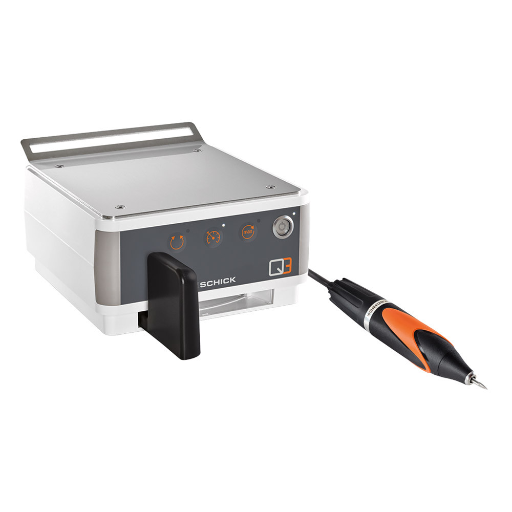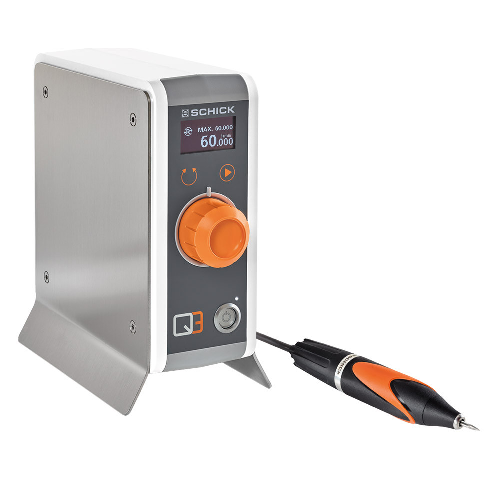 Die neue Q3-Serie von Schick bietet mit bis zu 60000 U/min. und 11 Ncm unschlagbar hohe Leistungsparameter. Dank neuer Technologie lässt sich die Drehzahl extrem feinfühlig regeln und eignet sich deshalb optimal für die Bearbeitung auch von anspruchsvollsten Dentalwerkstoffen. Auf dem hellen OLED-Display werden alle wichtigen Parameter übersichtlich dargestellt und sind aus allen Blickwinkeln gut ablesbar. Zusatzfunktionen wie z. B. Rechts-/Linkslauf und Tempomat lassen keine Wünsche offen und können bequem über Direktwahltasten aktiviert werden. Das Q3 Premium mit Q3 Motorhandstück - das ultraleichte und ergonomisch perfekt ausbalancierte Motorhandstück, welches mit seinem robusten Innenleben auch für schwerste Schleif-, Trenn- und Fräsarbeiten geeignet ist.