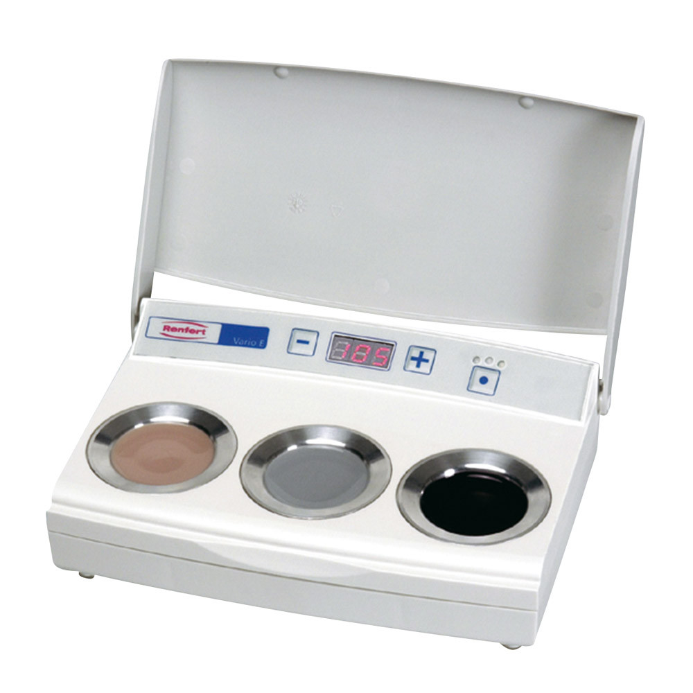 Mit dem Vario E werden Modellierwachse auf eine ideale Verarbeitungstemperatur vorgewärmt. • Die drei Wachsbecken werden separat gesteuert. Zusätzlich können sie einzeln ein- oder ausgeschaltet werden. • Mit dem erweiterten Temperaturintervall von 45 °C bis 110 °C (104 - 230 °F) ist auch die Verarbeitung von niedrigschmelzenden Lichtwachsen möglich. • Die Neigung des Displays bietet eine gute und blendfreie Sicht auf die Bedienelemente. Diese sind mit einer Folie geschützt und bei Bedarf leicht zu reinigen. • Das Beckendesign ermöglicht einen optimalen Rücklauf des Wachses am Beckenrand. Durch die tieferen Becken ist auch der Einsatz als Wachstauchgerät möglich. Technische Daten: Abmessungen: 178 x 54 x 120 mm (B x H x T) Arbeitstemperatur: 45 °C - 110 °C Netzspannung: 230 V Gewicht: ca. 658 gMit dem Vario E werden Modellierwachse auf eine ideale Verarbeitungstemperatur vorgewärmt.