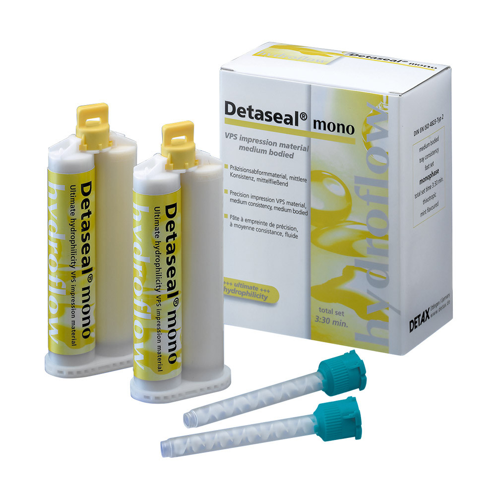 VPS Präzisionsabformmaterial, hydrophil aktiv, mittlere Konsistenz, thixotrop, schnellabbindend. Universell verwendbar für Ein- und Zweiphasenabformungen. Detaseal hydroflow mono zeichnet sich durch eine sofortige ultimative Hydrophilie aus. Die Erfassung feinster Details, besonders auch der feuchten Abformbereiche, wird dadurch gewährleistet.