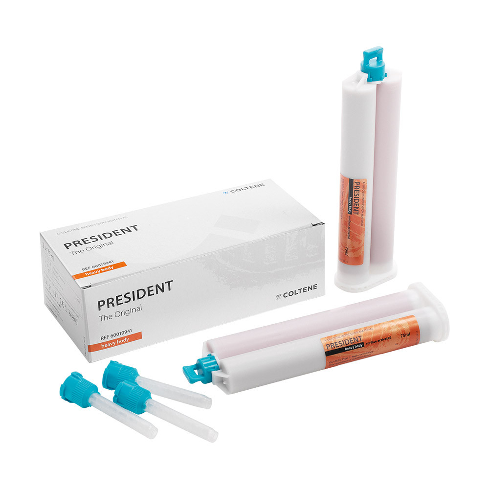 Durch die erstmalige Verwendung von Polyvinylsiloxan-(PVS-)Elastomeren erreichten PRESIDENT Anwender eine noch nie dagewesene Dimensionsstabilität und Präzision, welche noch heute ein A-Silikon charakterisiert. Die klassischen PRESIDENT Löffelmaterialien besitzen eine sehr hohe Reißfestigkeit und Elastizität. Dank einwandfreier Entnahme der Abformung wird selbst unter schwierigsten Bedingungen eine sehr hohe Präzision erreicht. PRESIDENT heavy body ist oberflächenaktiviert und besitzt thixotrope Eigenschaften. Mit seinem schnellen Druckaufbau wird dafür gesorgt, dass Korrekturmaterialien schnell und einfach in die klinisch relevanten Zonen vordringen können.