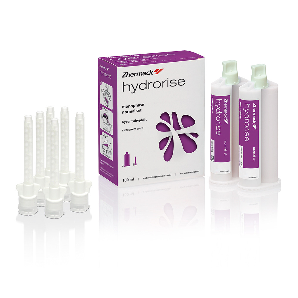 Hydrorise Monophase ist ein hyper-hydrokompatibles A-Silikon. Diese Eigenschaft erhöht die Fließfähigkeit des Silikons und verbessert dadurch die Genauigkeit der Abformung. Das Monophasenmaterial überzeugt durch seine hervorragende Rückstellfähigkeit und hohe Dimensionsstabilität bis zu 21 Tagen und ist zudem biokompatibel und reißfest.