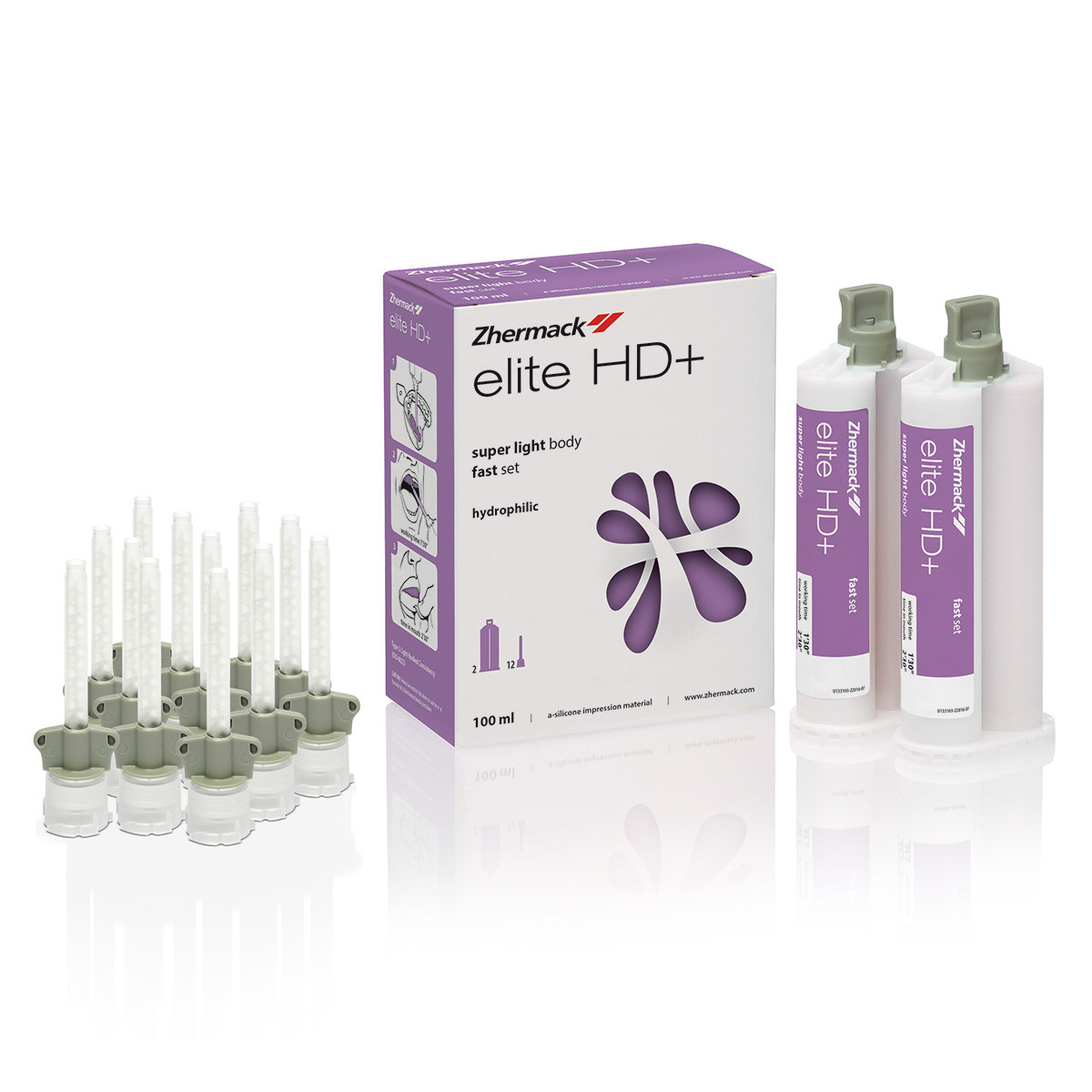 Elite HD+ Super Light Body ist das sehr dünnfließende Material aus der Elite HD+ Linie und wird als Korrekturmasse verwendet. Elite HD+ ist ein A-Silikon, das die Vorteile aus Hydrokompatibilität und Thixotropie, Reißfestigkeit und elastischem Rückstellvermögen vereint – für einen präzisen Abdruck. Es bietet zudem einen visuellen Komfort durch den Farbkontrast der unterschiedlichen Viskositäten. • Sehr dünnfließend • Thixotrop • Hydrokompatibel • Hohe Rückstellfähigkeit • Dimensionsstabilität bis zu 15 Tagen