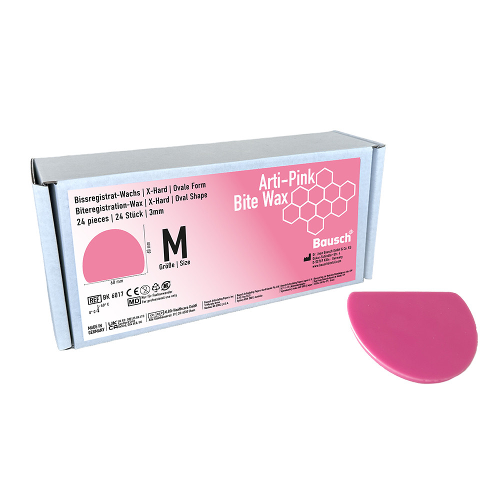 Arti-Pink Bite Wax von Bausch dient der präzisen Bissregistrierung und ermöglicht die genaue Abbildung von Konturen im Schlussbiss. Es zeichnet sich durch seine hervorragenden Modelliereigenschaften aus. Mit einer Stärke von 3 mm ist dieses extra harte Wachs nicht nur als Platte im Format 150 mm x 80 mm, sondern auch in ovaler Form in den vorgefertigten Größen S, M und L verfügbar. Um Arti-Pink Bite Wax zu verwenden, erwärmen Sie das extra harte Wachs in heißem Wasser bis es die Schmelztemperatur von ca. 55° C erreicht. Dadurch wird es formbar und bereit für den Einsatz zur exakten Bissregistrierung.