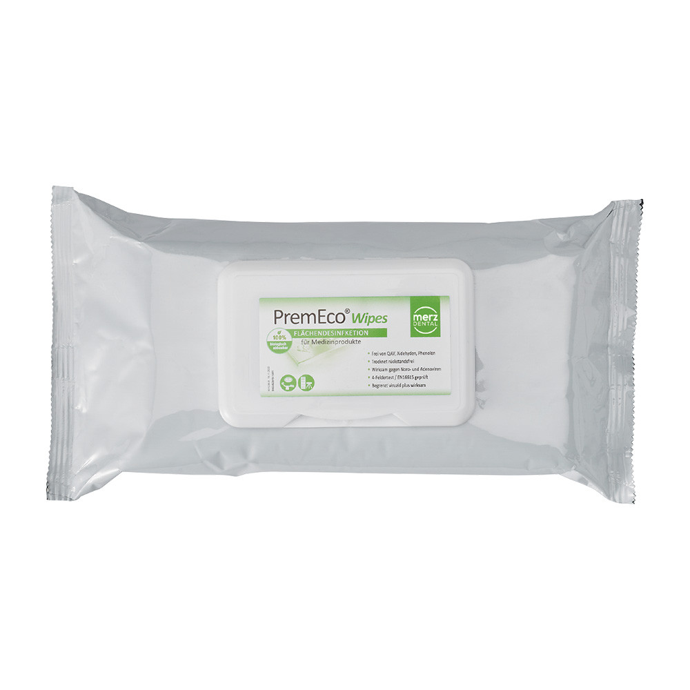 Die PremEco Wipes sind gebrauchsfertige Tücher im Flowpack zur Reinigung und Desinfektion von alkoholbeständigen Oberflächen von Medizinprodukten wie beispielsweise Behandlungseinheiten, Untersuchungsliegen, patientennahe Flächen, sowie andere Flächen, wie z. B. Tische, Türklinken usw. • Frei von quartären Ammoniumverbindungen, Phenolen, Aldehyden. • Begrenzt viruzid plus wirksam (wirksam gegen alle behüllte Viren inkl. BVDV/Vaccinia, Noro- und Adenoviren) Bovine Virusdiarrhöe Virus • 100% biologisch abbaubar! • Trocknet rückstandsfrei – keine Schlieren • Wirksam gegen Noro und Adenoviren • 4-Feldertest / EN16615 geprüft