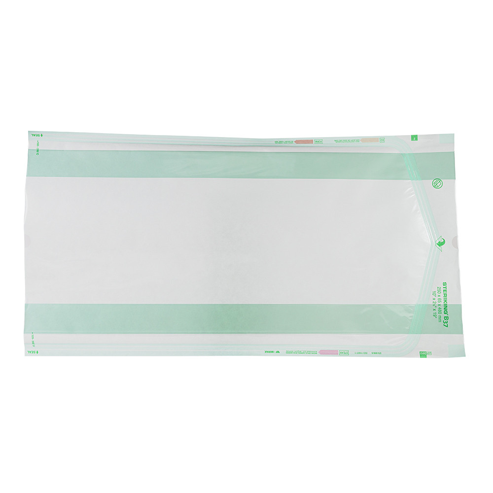 Beutel mit Seitenfalte für größere Gegenstände. Mit aufgedrucktem Prozessindikator für Dampf-, EO- und FO-Sterilisation.