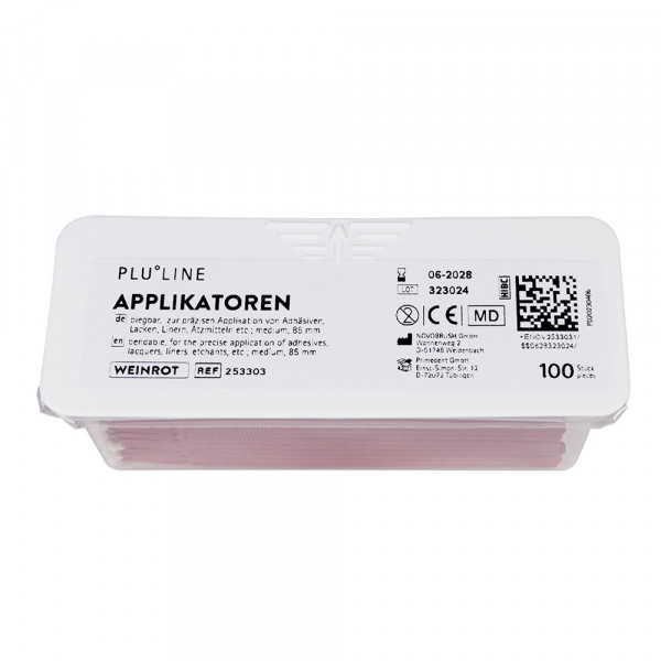 Feine Applikationsstäbchen (beflockt) zur punktgenauen Applikation aller Flüssigkeiten, Gels und Pasten (Lacke, Liner, Ätzmittel, Adhäsive). • veflockte Enden für millimetergenaue Applikation • bei der Tropfen-Applikation von Flüssigkeiten wird nahezu die gesamte Menge abgegeben • mit biegbarem Kunststoffgriff