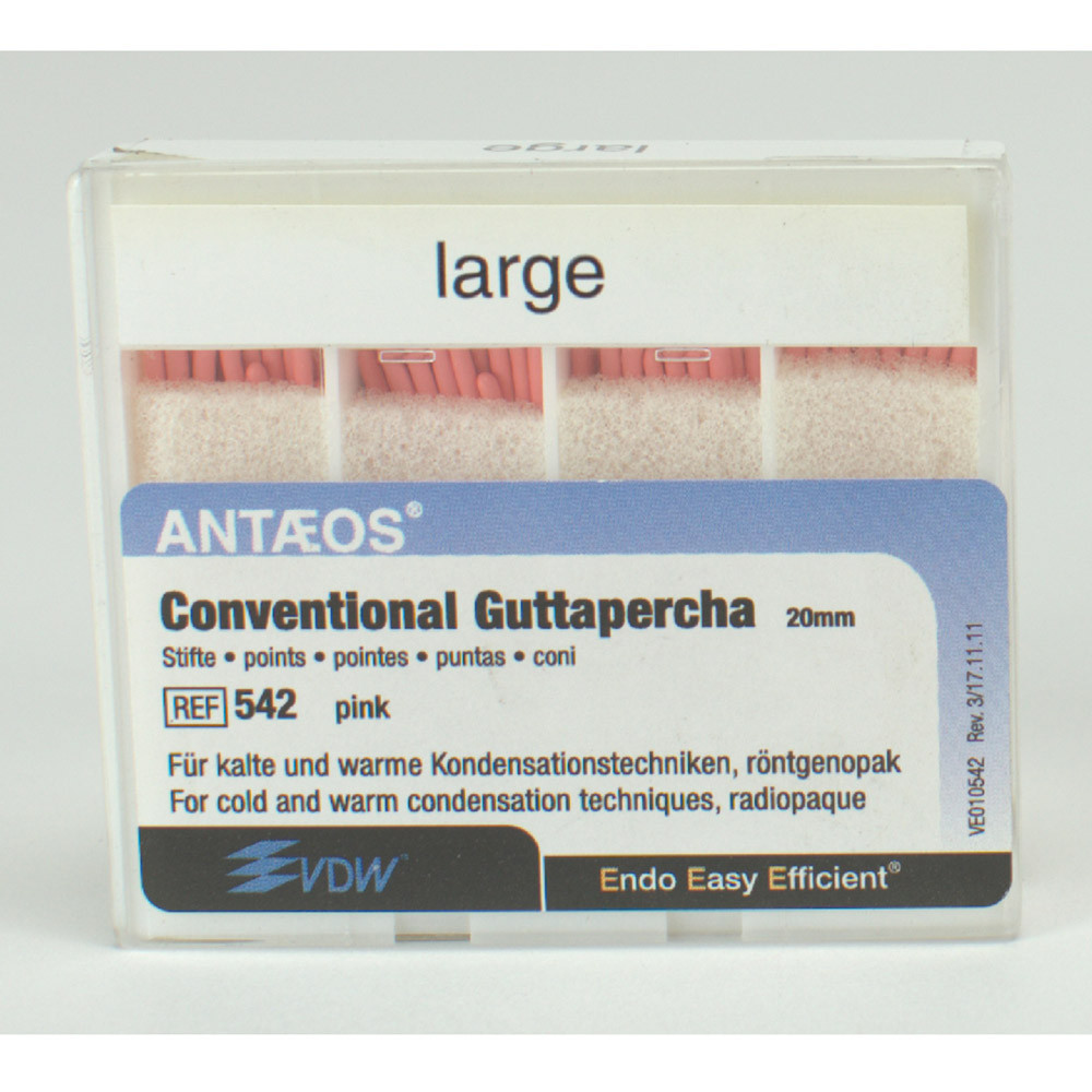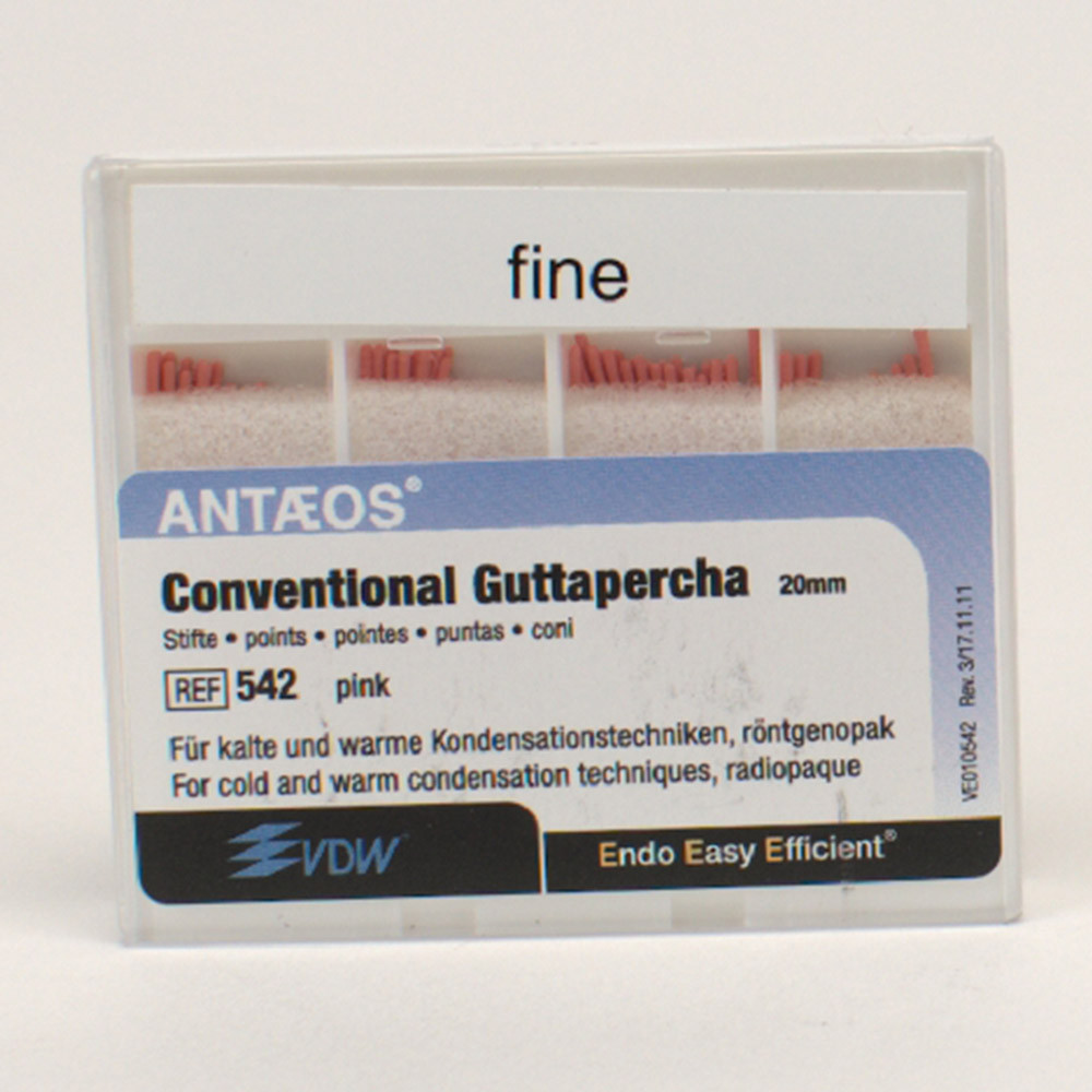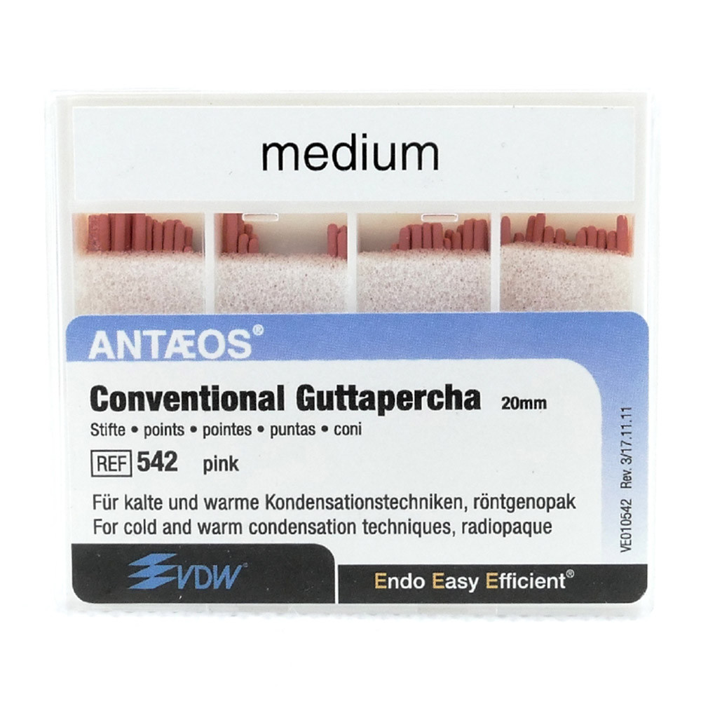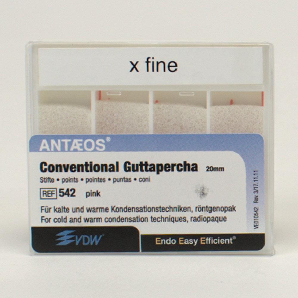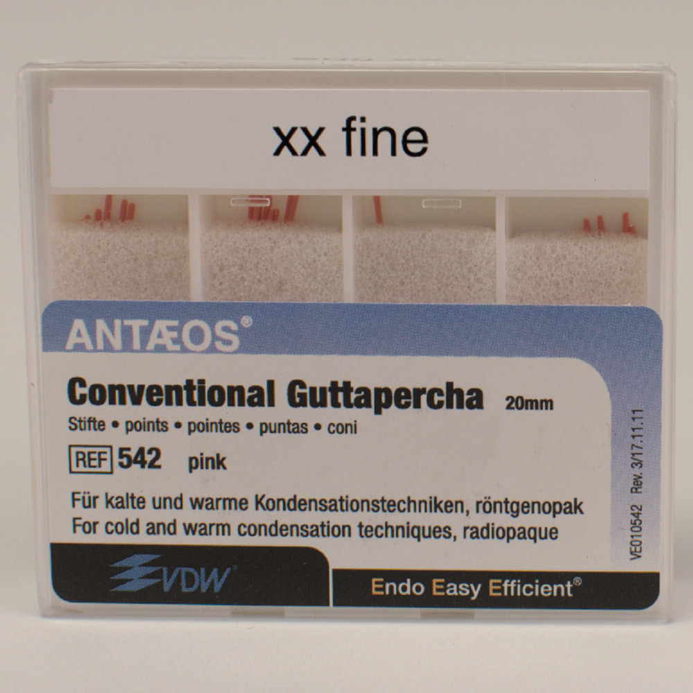 Konventionelle Guttapercha. Zusatzstifte für die Masterpoint-Methode. 20 mm kurze Stifte in konventionellen Größen.