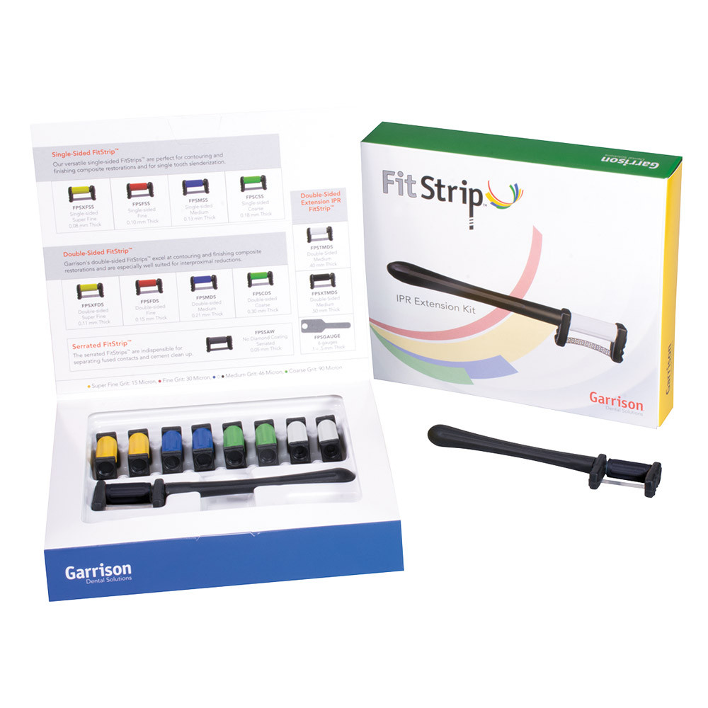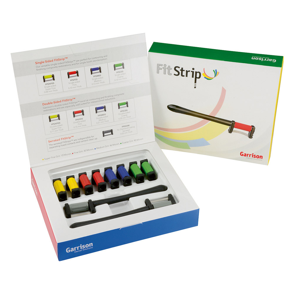 Das FitStrip Finier- und Konturiersystem zur Gestaltung von Approximalkontakten von Garrison versorgt Zahnärzte mit diamantbeschichteten Schleifstreifen, die für die erfolgreiche Restauration vieler verschiedener Fälle notwendig sind. FitStrip eignet sich für die Anwendung bei der approximalen Schmelzreduktion, zur Reduktion von Kontaktpunkten, zum Finieren und Konturieren von Approximalkontakten, zur Entfernung von Zement bzw. zur Reinigung bei Kronen und Brücken sowie zur Trennung von versehentlich verbundenen Zähnen. Der auswechselbare Griff lässt sich leicht an allen FitStrip-Komponenten befestigen, wodurch der Bedien- und Patientenkomfort beträchtlich gesteigert werden.
