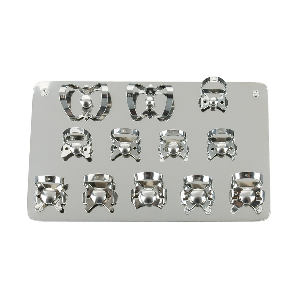 Klammerbord für Fit Kofferdam Klammern. Erhältlich in drei Ausführungen: für 8 Klammern, für 12 Klammern und für 18 Klammern. Edelstahl. Mit Klammern.