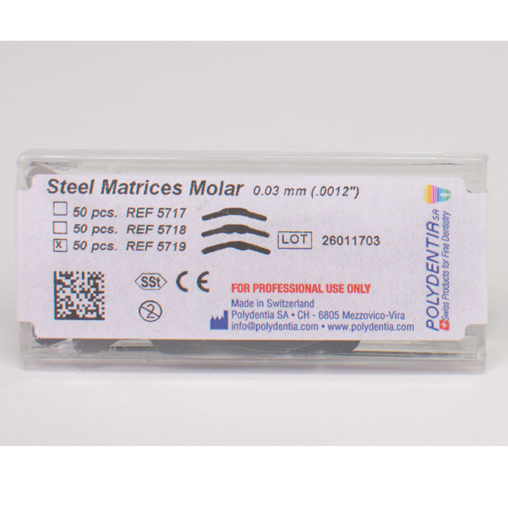 Aus rostfreiem Stahl, anatomisch vorgeformt. 3 verschiedene Formen für Prämolaren und Molaren. Verwendbar mit jedem Matrizenhalter. Seitenzahnmatrizen bis maximal 7 mm Höhe können mit Maximat Plus verwendet werden.