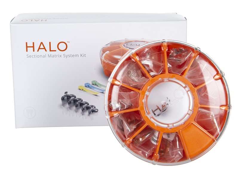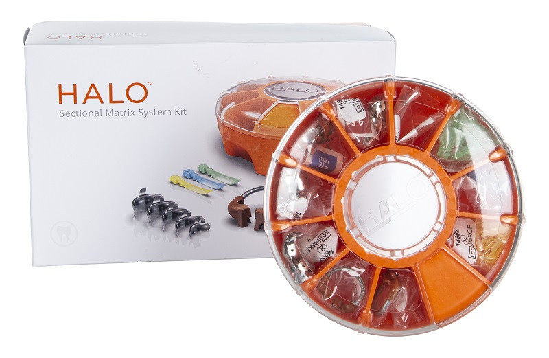 Effizient zu ästhetischen Ergebnissen. Das Halo Matrizensystem umfasst langlebige anatomisch geformte Nitinolringe, Matrizenbänder aus Edelstahl, Keile und einen innovativen Karusselspender, der übersichtliche Organisation aller Komponenten gewährleistet.