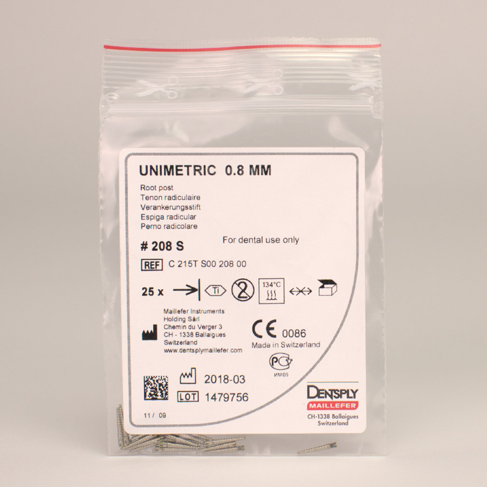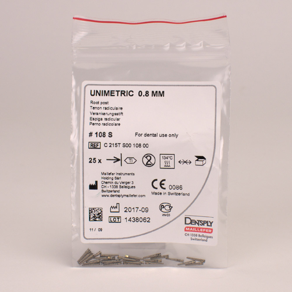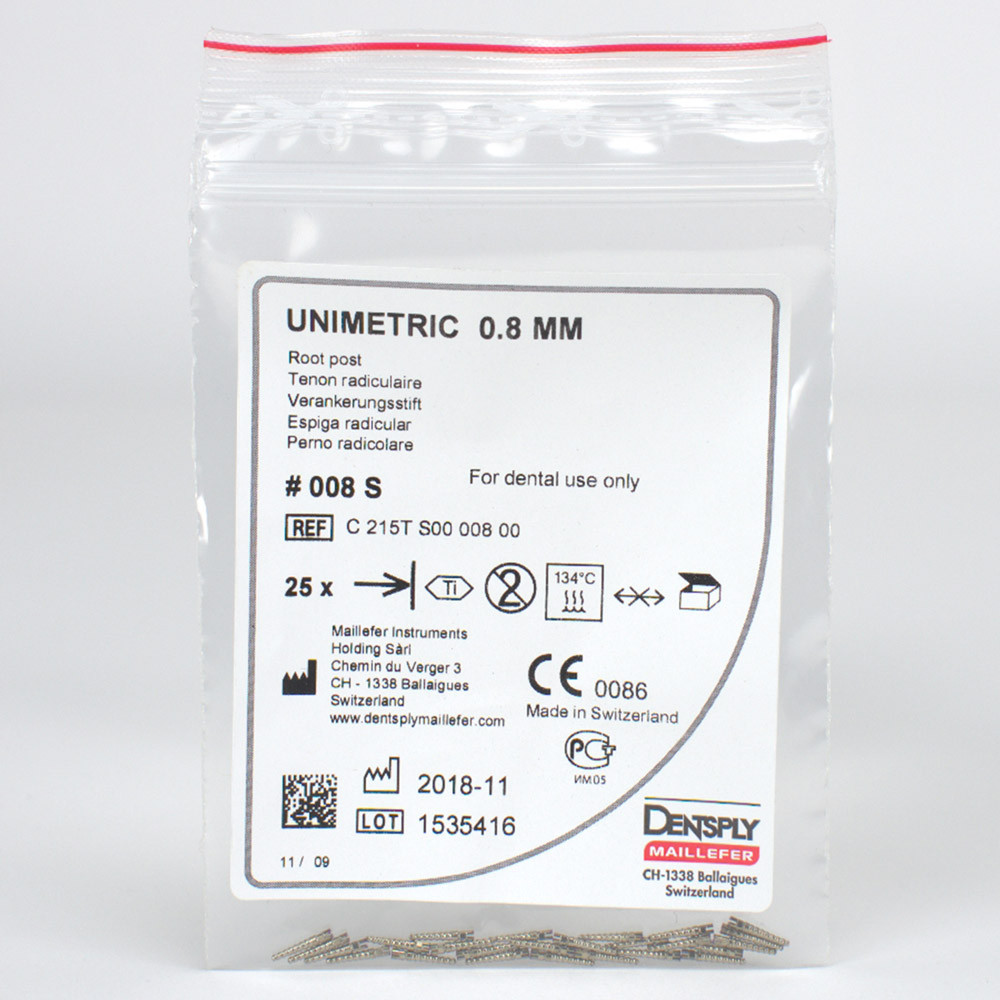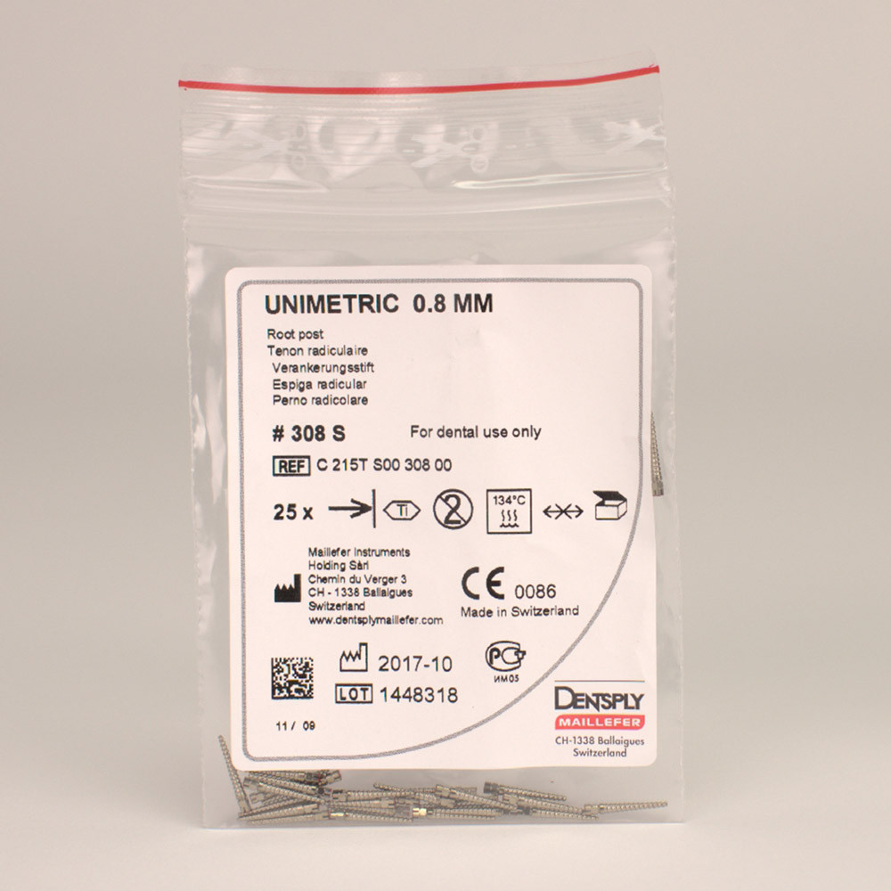 Das Unimetric-Stiftsystem ist ein rationelles Konzept zum Wiederaufbau endodontisch behandelter Zähne. Die Stifte sind wahlweise aus Titan oder Edelstahl erhältlich. Es stehen insgesamt 13 unterschiedliche Größen zur Verfügung in den Durchmessern 0,8 bzw. 1,0 mm und mit langem oder kurzem Kopf. Das Präzisionsinstrumentarium ist farbcodiert.