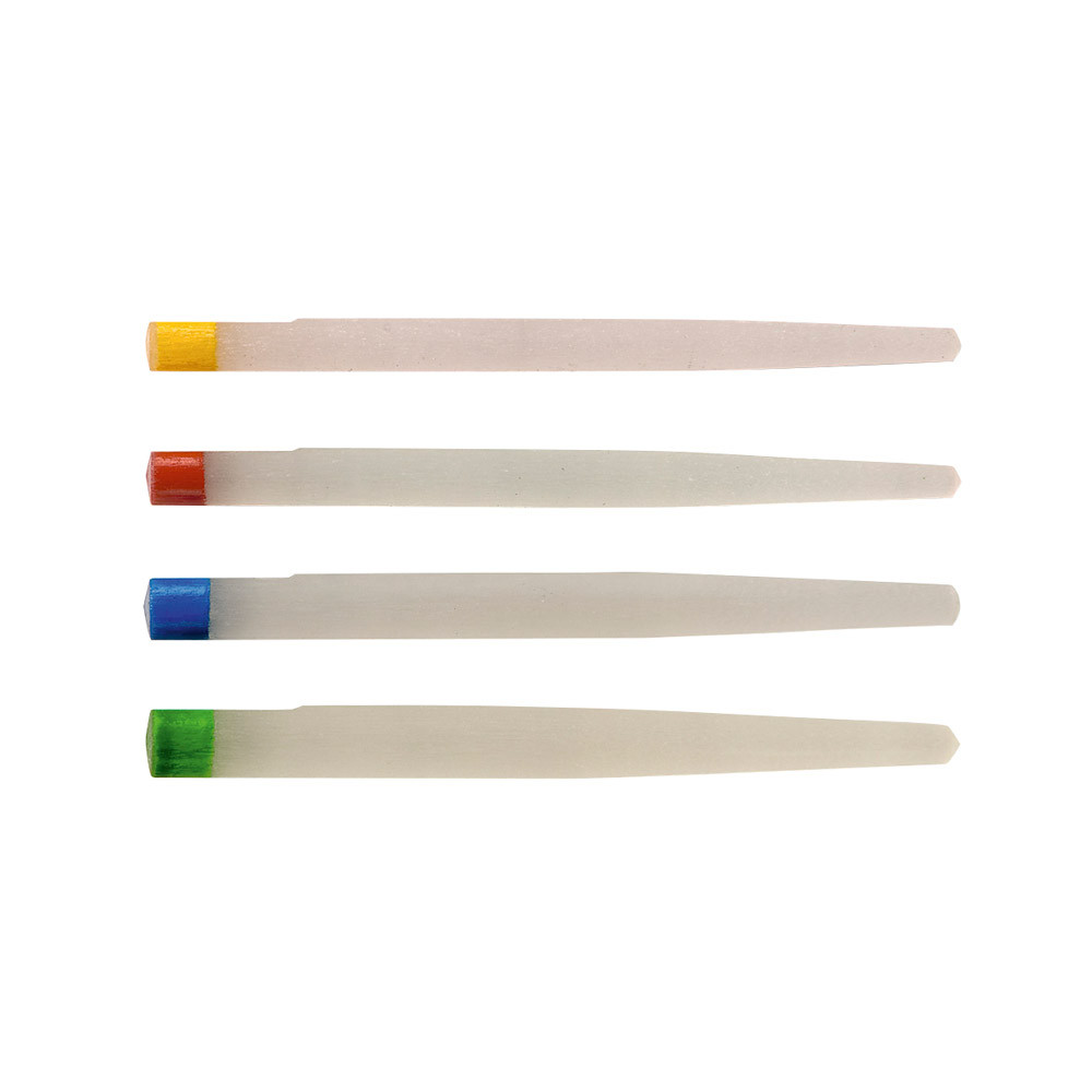 Transluzenter, faserverstärkte, zylindrokonische Stifte, röntgenopak, reduziertes Risiko von Wurzelfrakturen durch 60 % Quarzfasern und 40 % Epoxy-Resin Matrix. Farbcodierung am Stiftende.