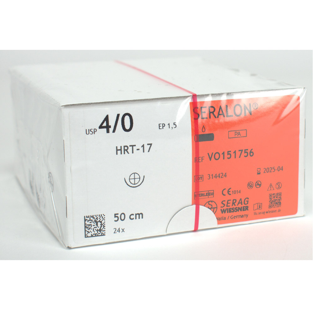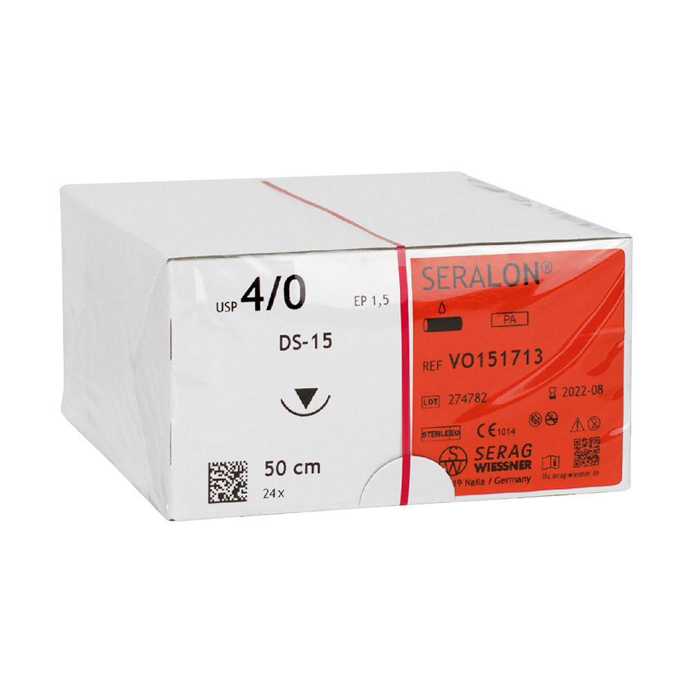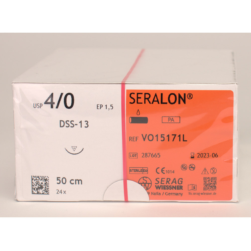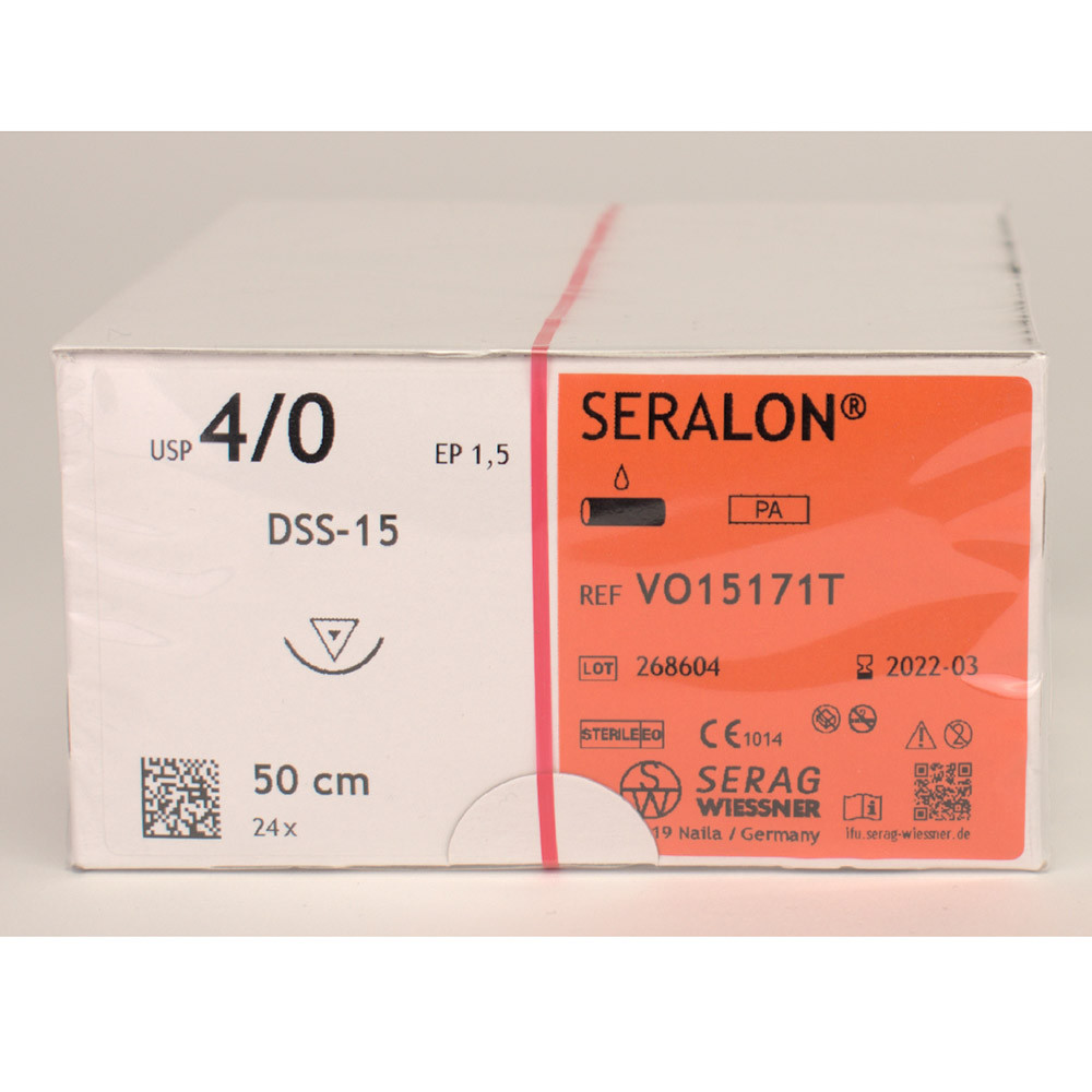 SERALON® ist ein Polyamidfaden, der vergleichsweise zu herkömmlichem monofilem Nahtmaterial auffallend weich und geschmeidig ist. Besondere Eigenschaften: es handelt sich um einen idealen Hautfaden mit hervorragender Gleitfähigkeit. Die sehr hohe Linear- und Knotenreißkraft bei feiner Ausmessung, das angenehme Handling helfen bei einer einfachen Verarbeitung ebenso wie die Verfügbarkeit von wirtschaftlichen Großpackungen (24 Stück).
