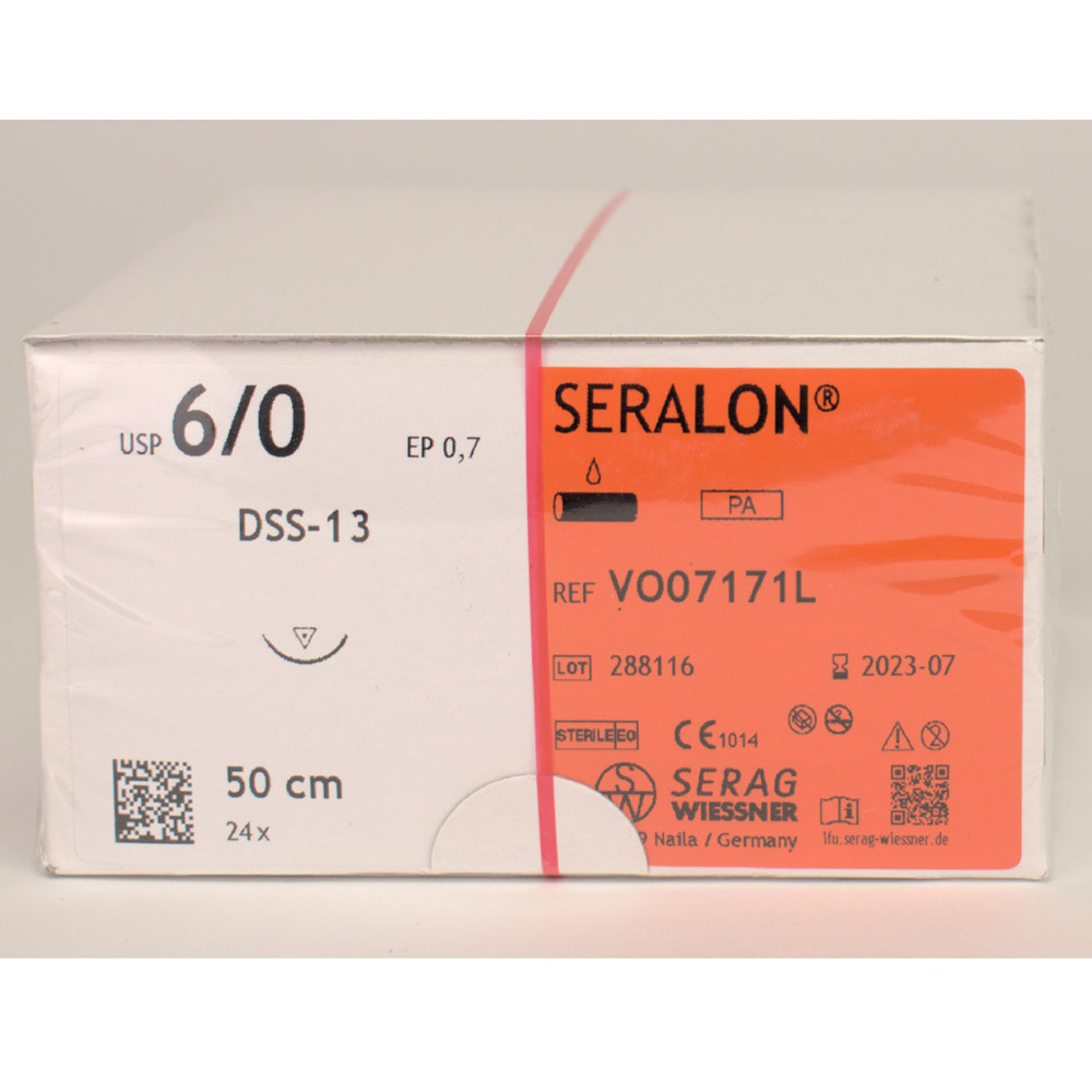 SERALON® ist ein Polyamidfaden, der vergleichsweise zu herkömmlichem monofilem Nahtmaterial auffallend weich und geschmeidig ist. Besondere Eigenschaften: es handelt sich um einen idealen Hautfaden mit hervorragender Gleitfähigkeit. Die sehr hohe Linear- und Knotenreißkraft bei feiner Ausmessung, das angenehme Handling helfen bei einer einfachen Verarbeitung ebenso wie die Verfügbarkeit von wirtschaftlichen Großpackungen (24 Stück).