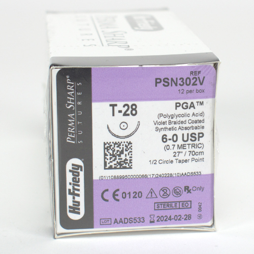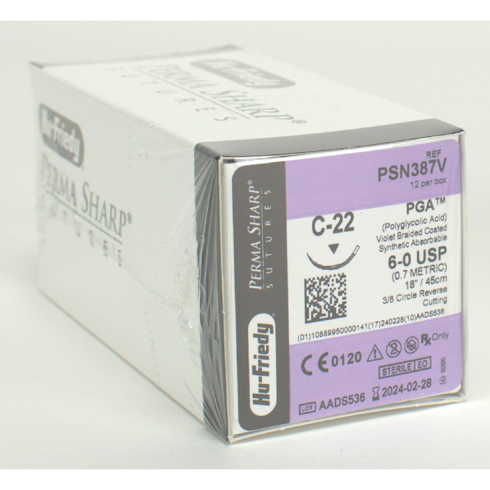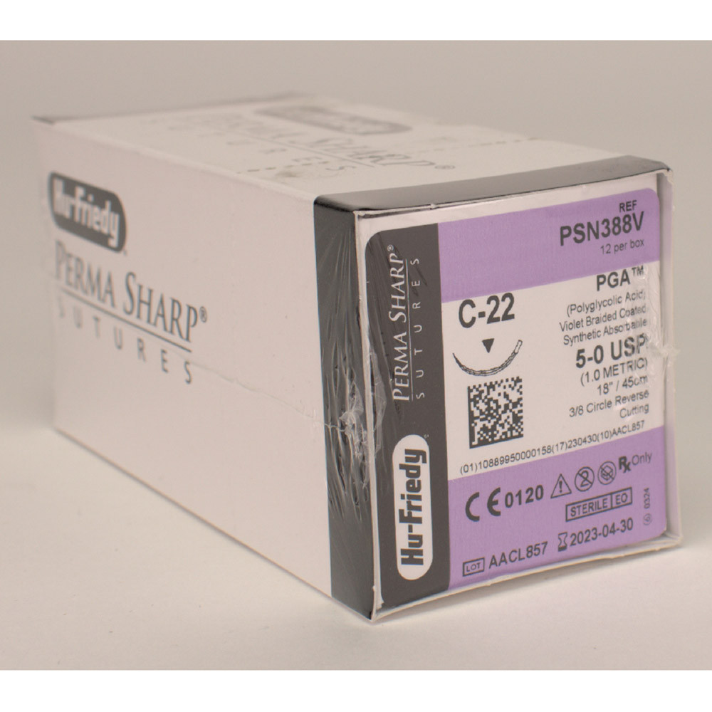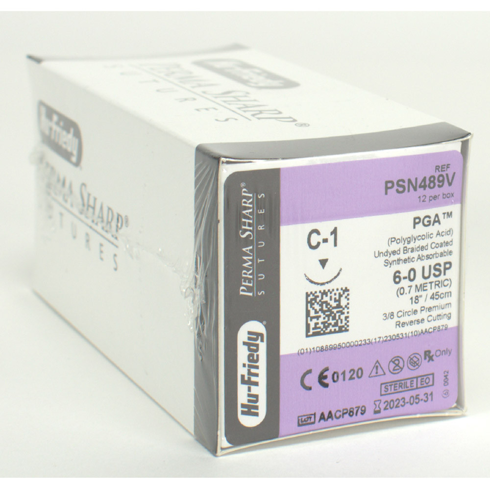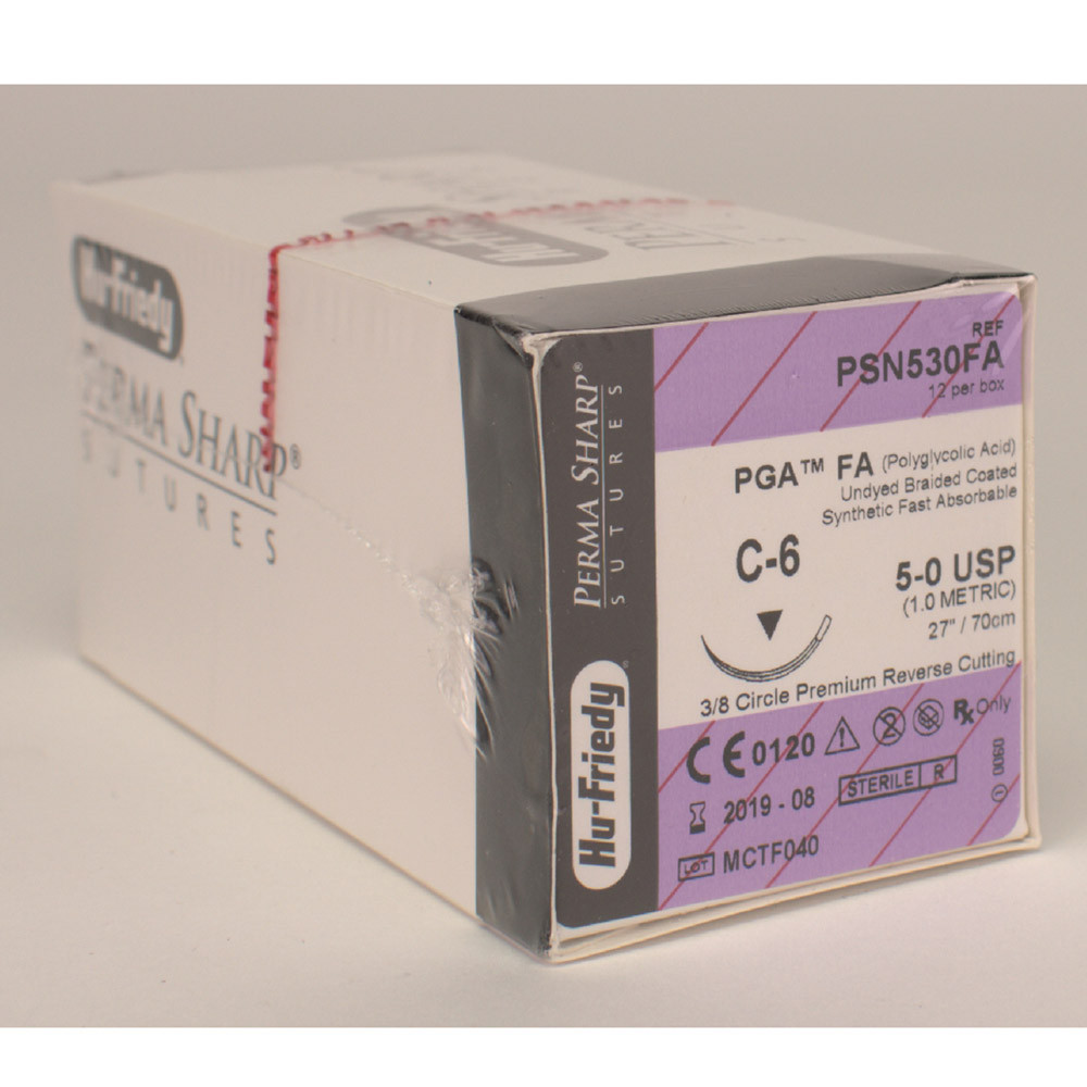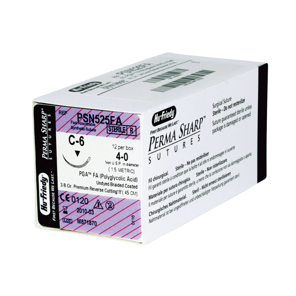 Perma-Sharp Nadel-Faden-Kombinationen von Hu-Friedy werden aus einer erstklassigen Edelstahllegierung hergestellt. Diese ist aufgrund ihrer Eigenschaften ideal für den Dentalbereich. In der Produktion lässt sich der Stahl absolut regelmäßig schärfen und erlaubt so eine hochfeine Spitze. Vom ersten Anstich bis zum letzten bleibt die Nadel spitz und scharf. Hu-Friedy Nahtmaterial ist auch auf Rezept erhältlich. Für eine sichere Handhabung sollten Sie die Nadelhalter anwenden, die für die jeweiligen Nadelstärken konzipiert wurden. PGA: Dieser geflochtene Copolymer aus Glycolid und L-Lactid verbindet gute Handhabungs-Eigenschaften (Knoten). Reißkraftdauer: 17-21 Tage. PGA verliert an Festigkeit in 14-17 Tagen und ist innerhalb 90-120 Tagen resorbiert.