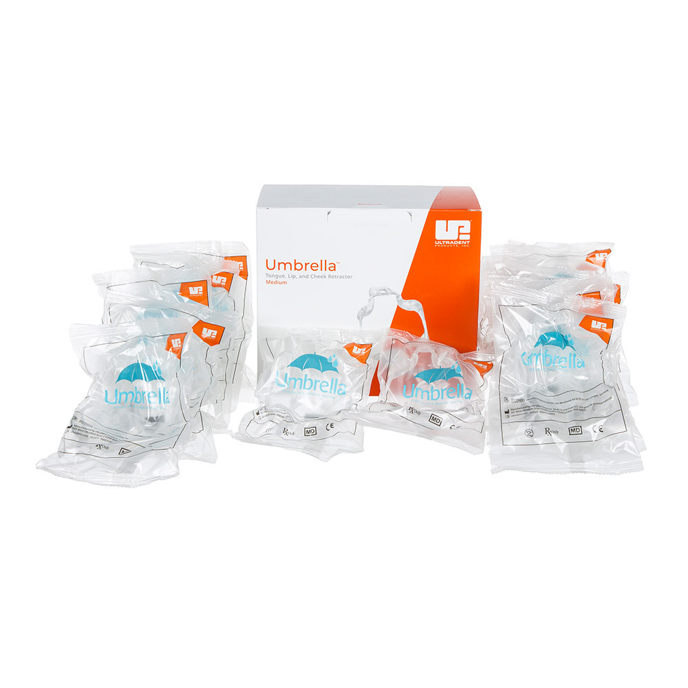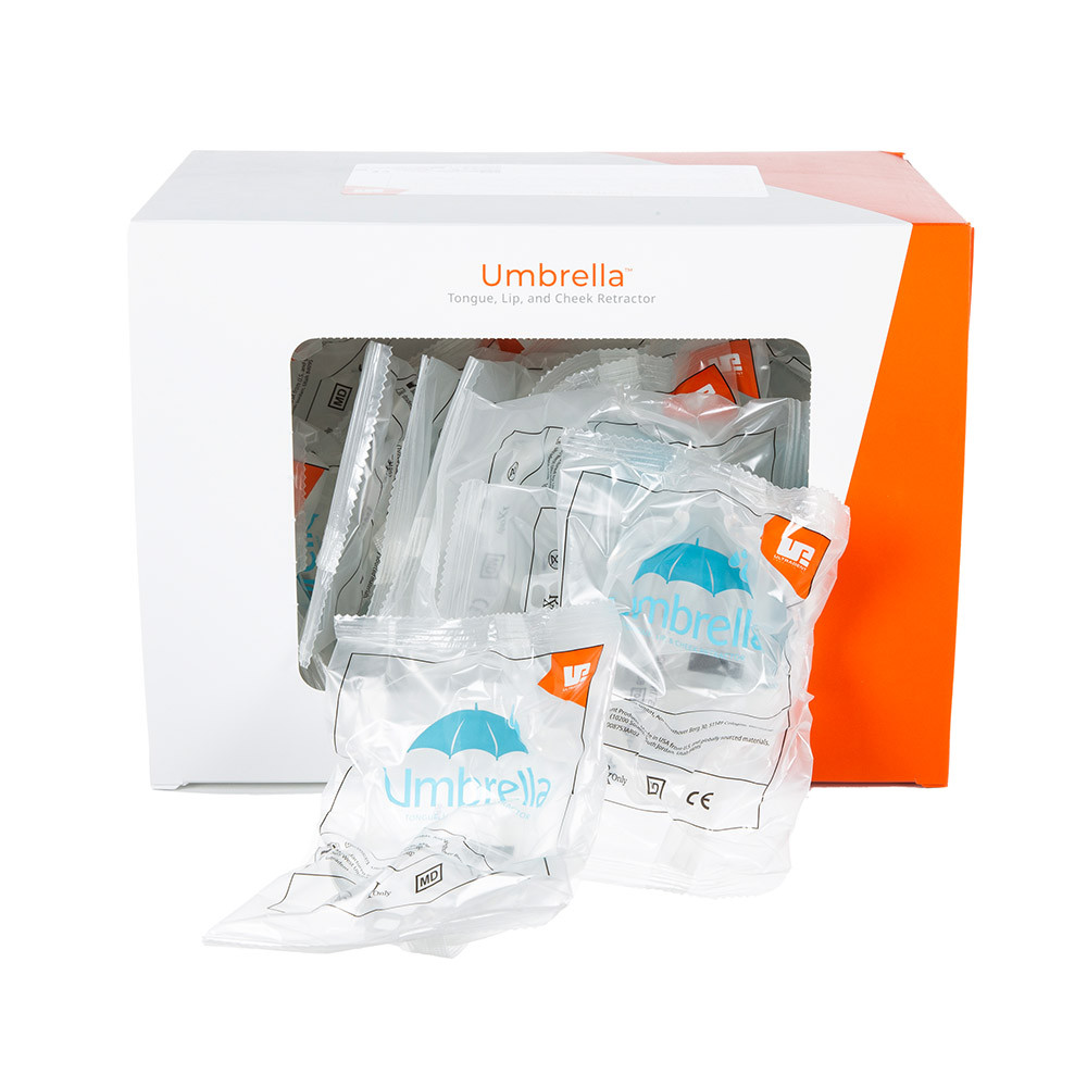 Der NEUE Umbrella Zungen-, Lippen- und Wangenhalter gewährleistet einen herausragenden Patientenkomfort und eine schnelle, einfache Positionierung. Die perfekte Kombination. Der innovative Zungenschutz liegt bequem unter der Zunge, gewährleistet ihre Retraktion und hält sie vom Arbeitsbereich fern. • Einfache Positionierung • Natürliche, sanfte Öffnung des Mundes - ganz ohne Ziehen oder Dehnen der Lippen • Die anatomisch geformten Halter bieten eine Ablagemöglichkeit für die Arbeitshand, ohne dem Patienten Beschwerden zu bereiten • Umbrella löst bei den meisten Patienten keinen Würgereiz aus • Umbrella verbleibt während der Bisskontrolle in Position oder ist in Verbindung mit einer Aufbisshilfe hilfreich