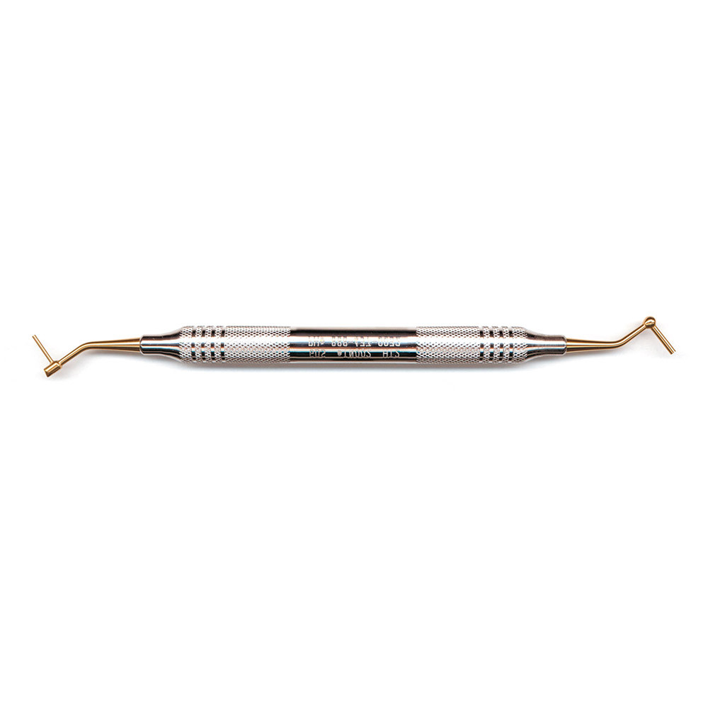 Multifunktions-Stopfer klein/mittel. Einbringen von Komposit. Verdichtung von Füllungsmaterial in approximalen Kästen. Ausarbeitung der okklusalen Anatomie. Verbesserte Ergonomie durch dicke, leichte Handgriffe. Antihaftoberfläche zum Einbringen und Ausformen von Kompositmaterialien. 40% härter als rostfreier Stahl, porenfrei glatte Antihaftoberfläche. Unempfindlich gegen verschiedenste Reinigungs-/Sterilisationsmethoden einschließlich Ultraschallreinigung.
