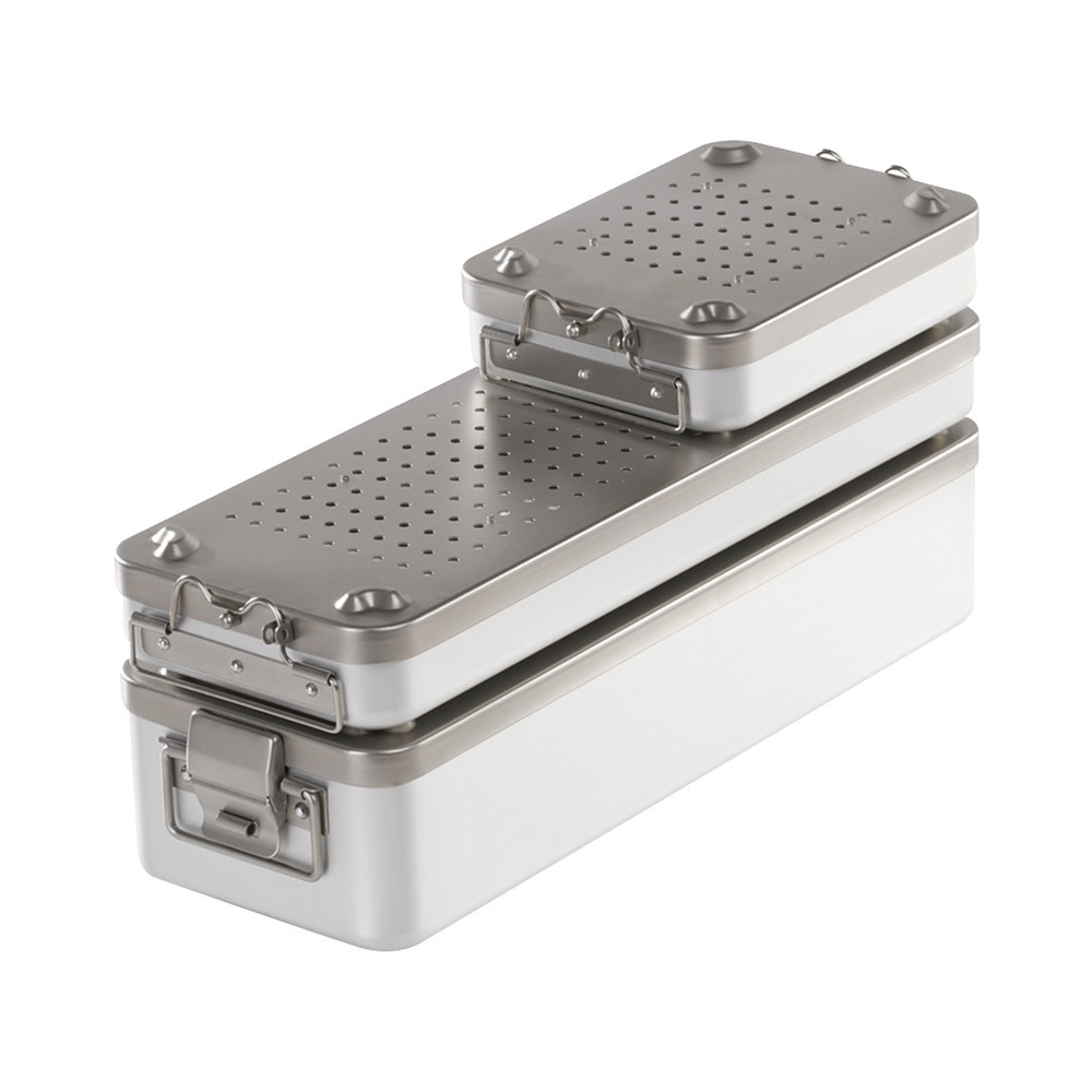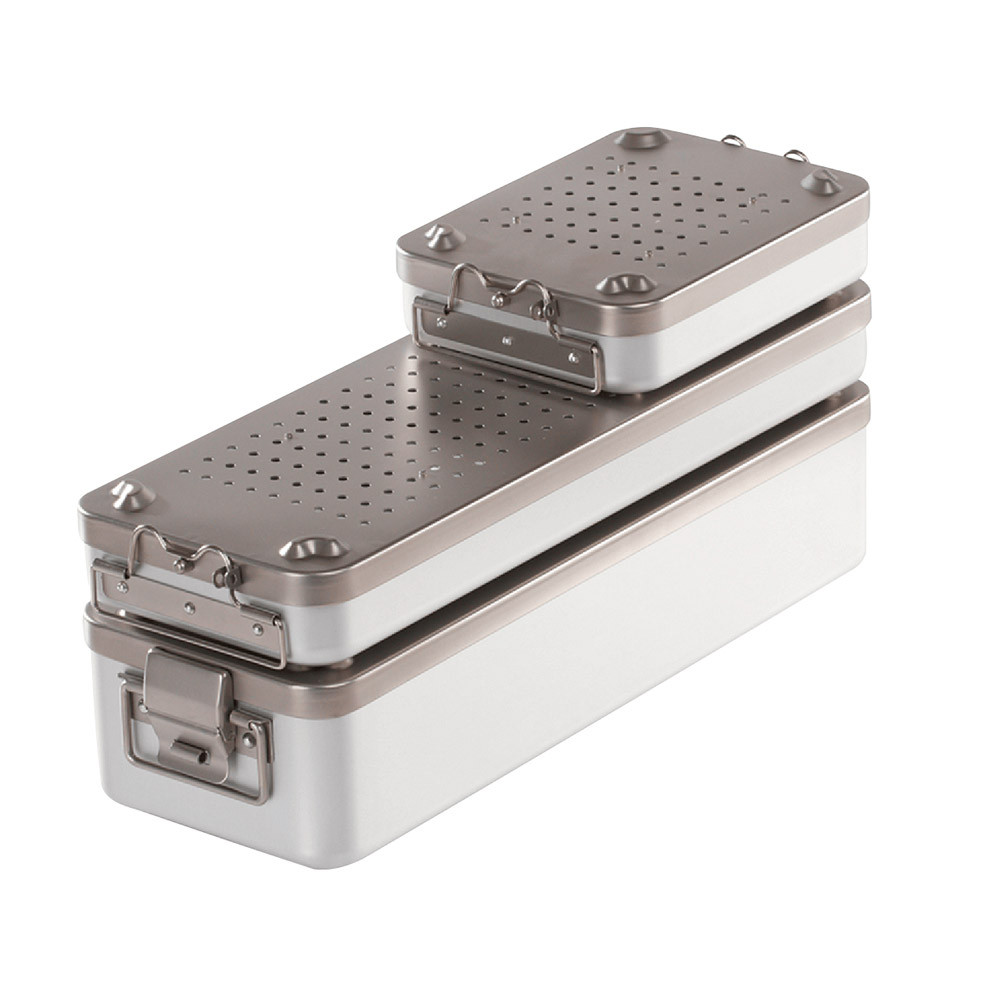 Die MELAG Sterilisierbehälter bestehen aus einem Unterteil aus eloxiertem Aluminium und einem Oberteil aus Edelstahl. Die Sterilisierbehälter sind im Boden und im Deckel gelocht und mit Einmal-Papierfiltern ausgestattet.