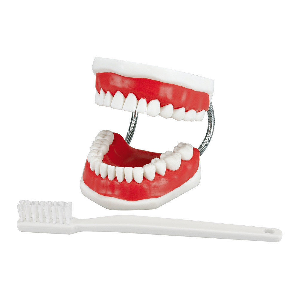 Vierfach vergrößertes Schaumodell. Zur Demonstration der richtigen Zahnputztechnik und der Anwendung von Zahnseide/ Interdentalbürsten. Mit entsprechend großer Zahnbürste. Ideal zur Motivation von Kindern.