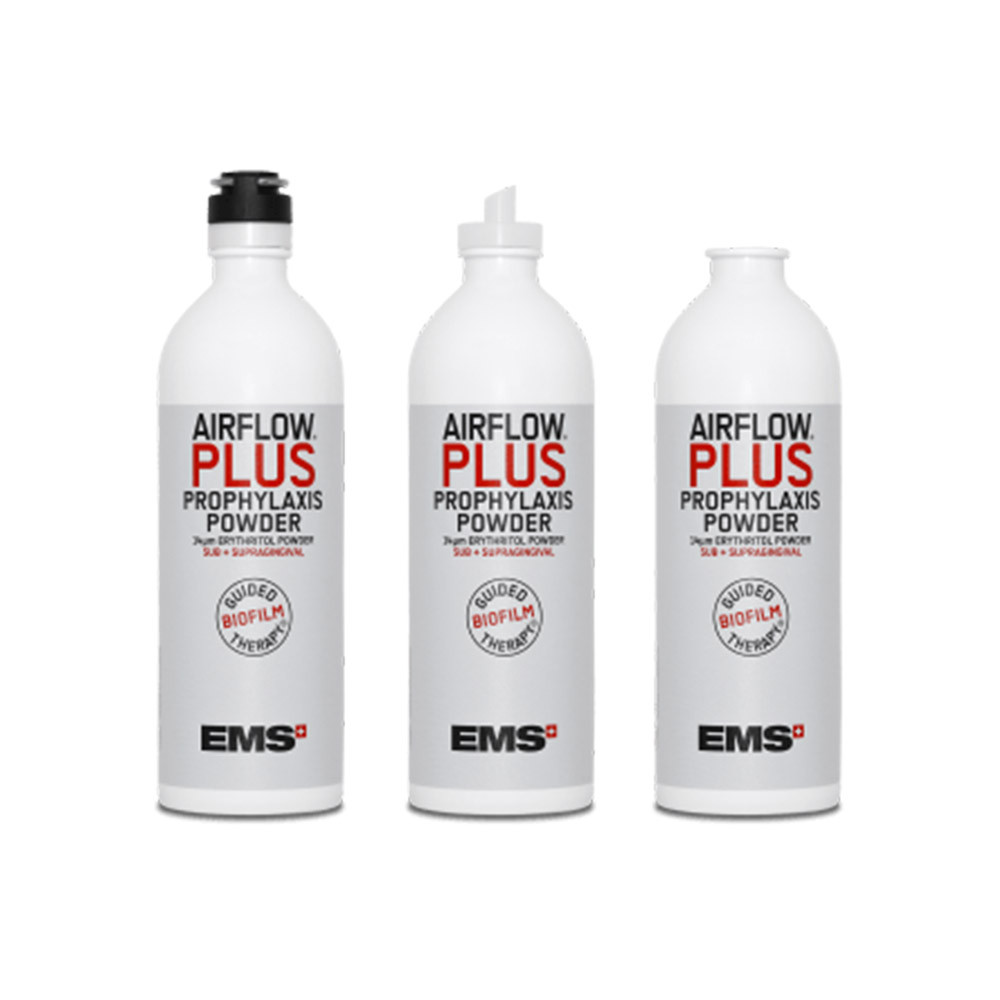 AIRFLOW PLUS Pulver ist ein High-Tech Pulver zur minimalinvasiven Entfernung von Biofilm und jungem Zahnstein von allen Oberflächenarten wie Zahnschmelz, Dentin, Weichgewebe, Zunge und Gaumen, Milchzähne, Kieferorthopädische Apparaturen, Implantat Oberflächen, Restaurationen. Das auf Erythritol basierende PLUS Pulver kann supra- und subgingival angewendet werden. Die Korngröße des PLUS Pulvers beträgt nur 14 µm. Kein salziger Geschmack. Das originale AIRFLOW PLUS Pulver gibt es jetzt für mehr Nachhaltigkeit in einer hochwertigen Aluminiumflasche (400 Gramm). Wenn sie leer ist, kann sie als Wasser-/Trinkflasche genutzt werden.