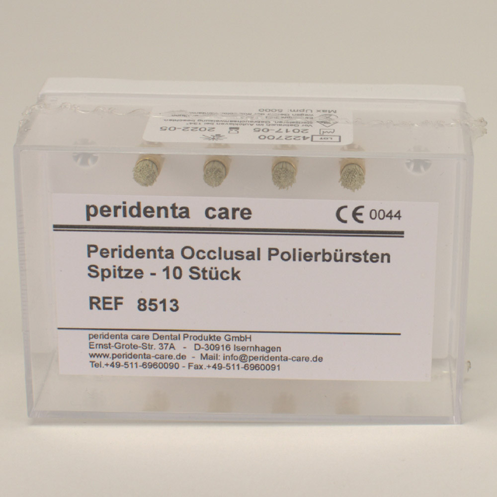 Peridenta Occlusale Polierbürsten bieten ein schnelles und wirkungsvolles Poliersystem für Restaurationen und natürliche Zähne. Polierpaste ist nicht notwendig, da die Polierkörper bereits in den Borsten eingearbeitet sind.