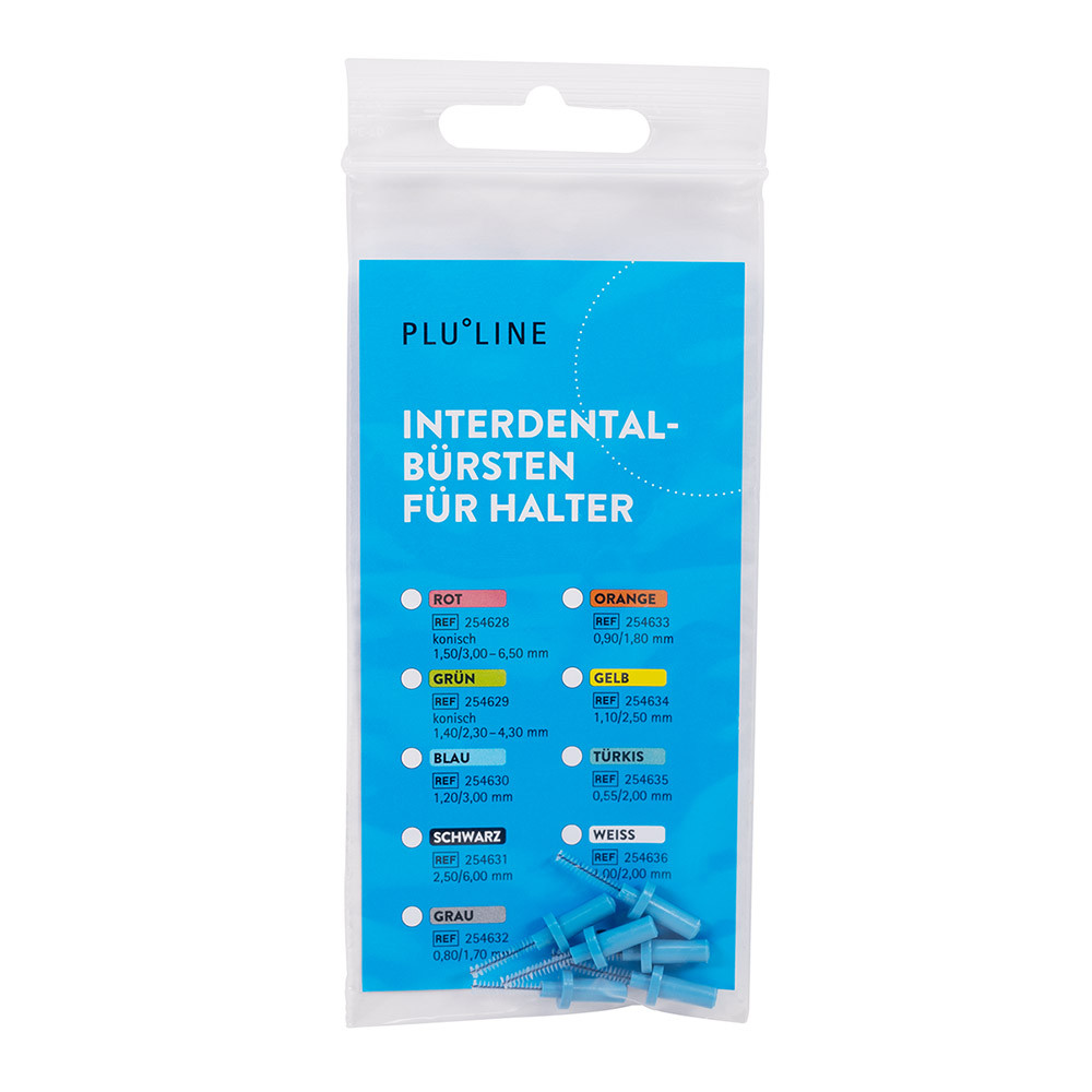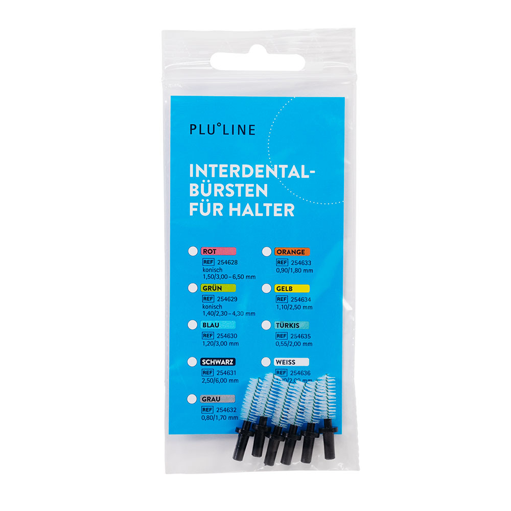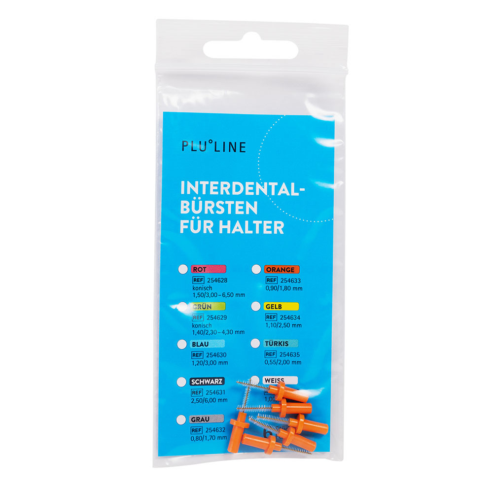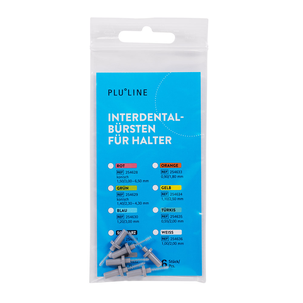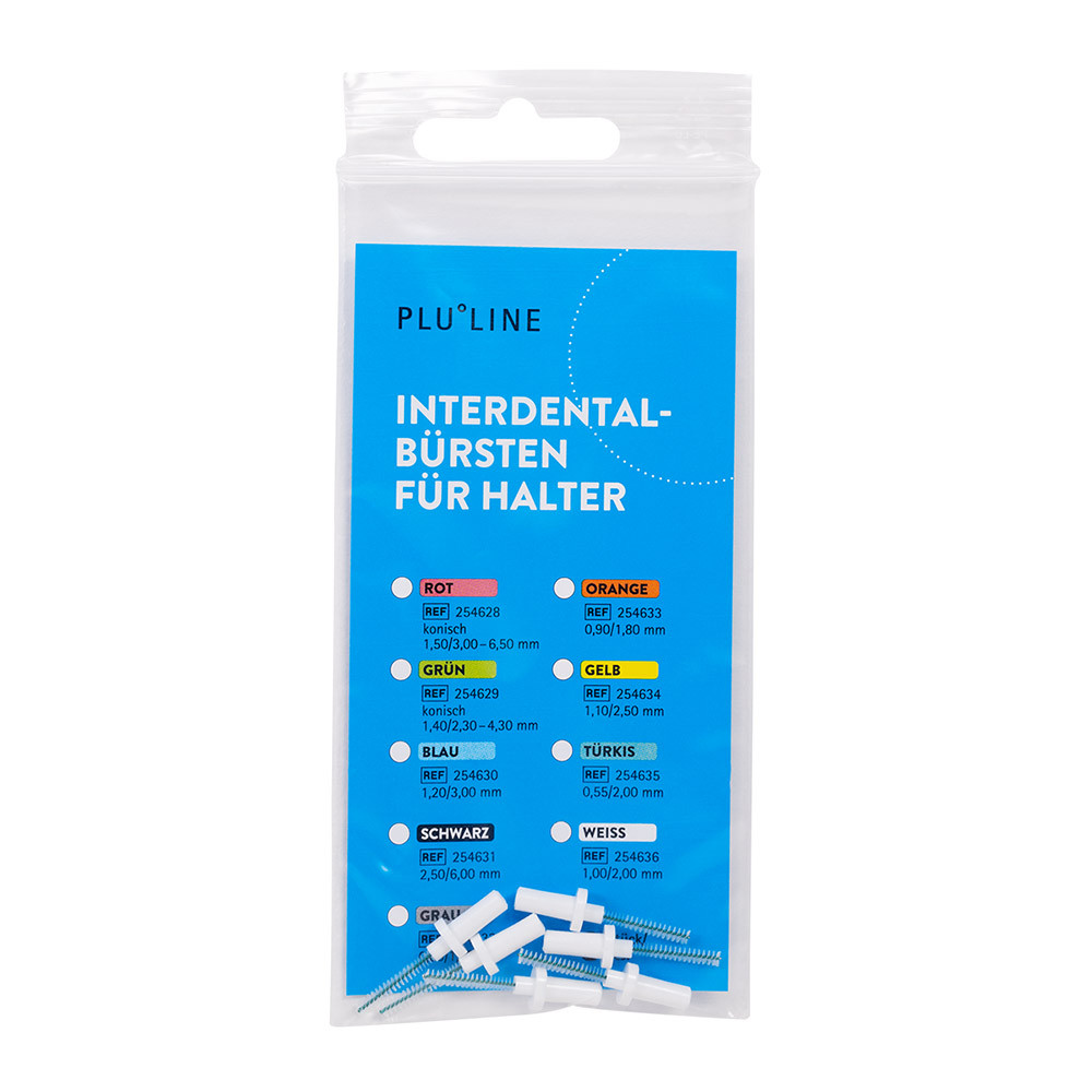 Pluline Interdentalbürsten in 9 verschiedenen Varianten zur Verwendung im Halter (Art.Nr.: 811633). Die Endstücke sind farbig codiert und der Bürstendraht ist kunststoffummantelt, dies verringert die Verletzungsgefahr und schützt vor einer Irritation an überempfindlichen Zahnhälsen. Verschiedenen Größen erlauben die Auswahl der optimalen Bürste für jeden Zahnzwischenraum. Die Interdentalbürsten sind mit dem perfekten Verhältnis von Borstenlänge zu Borstendicke ausgestattet, somit können Zähne und Zahnfleisch hygienisch und gesund erhalten werden.
