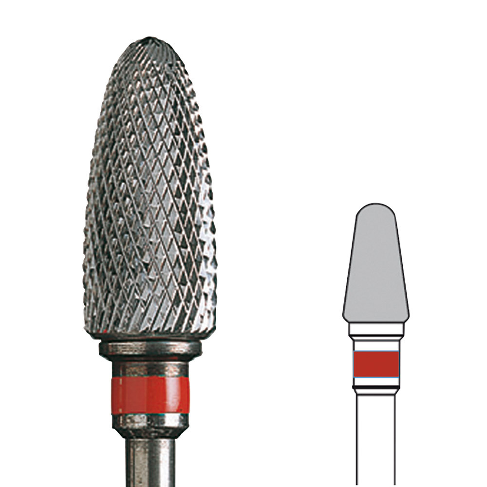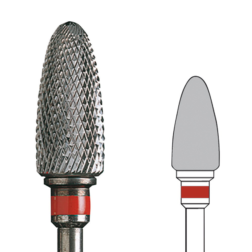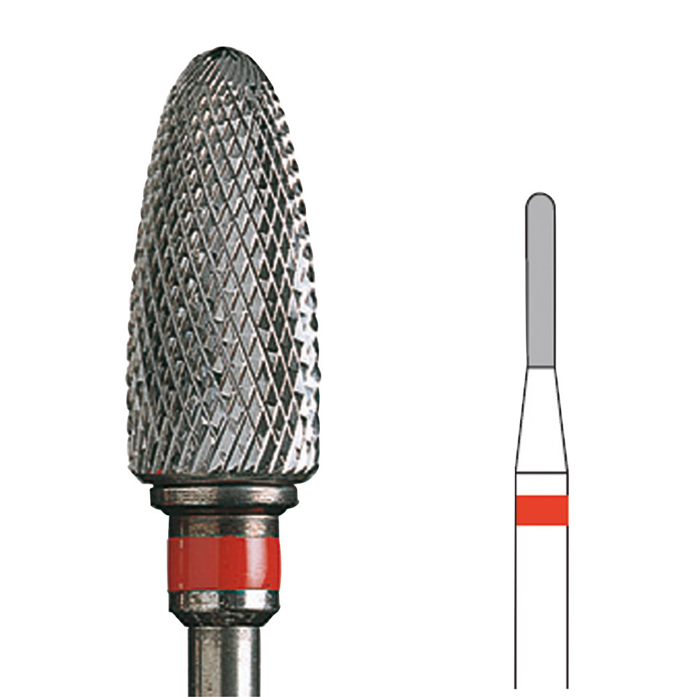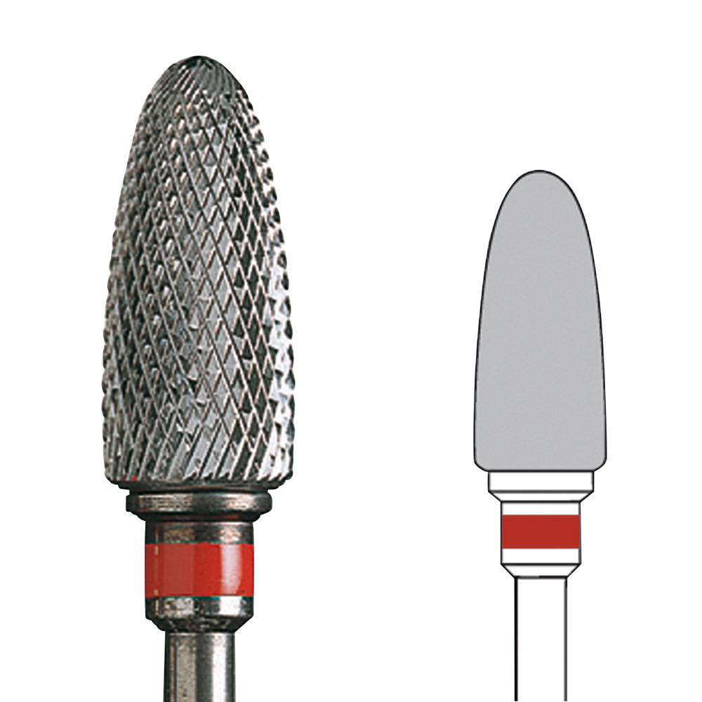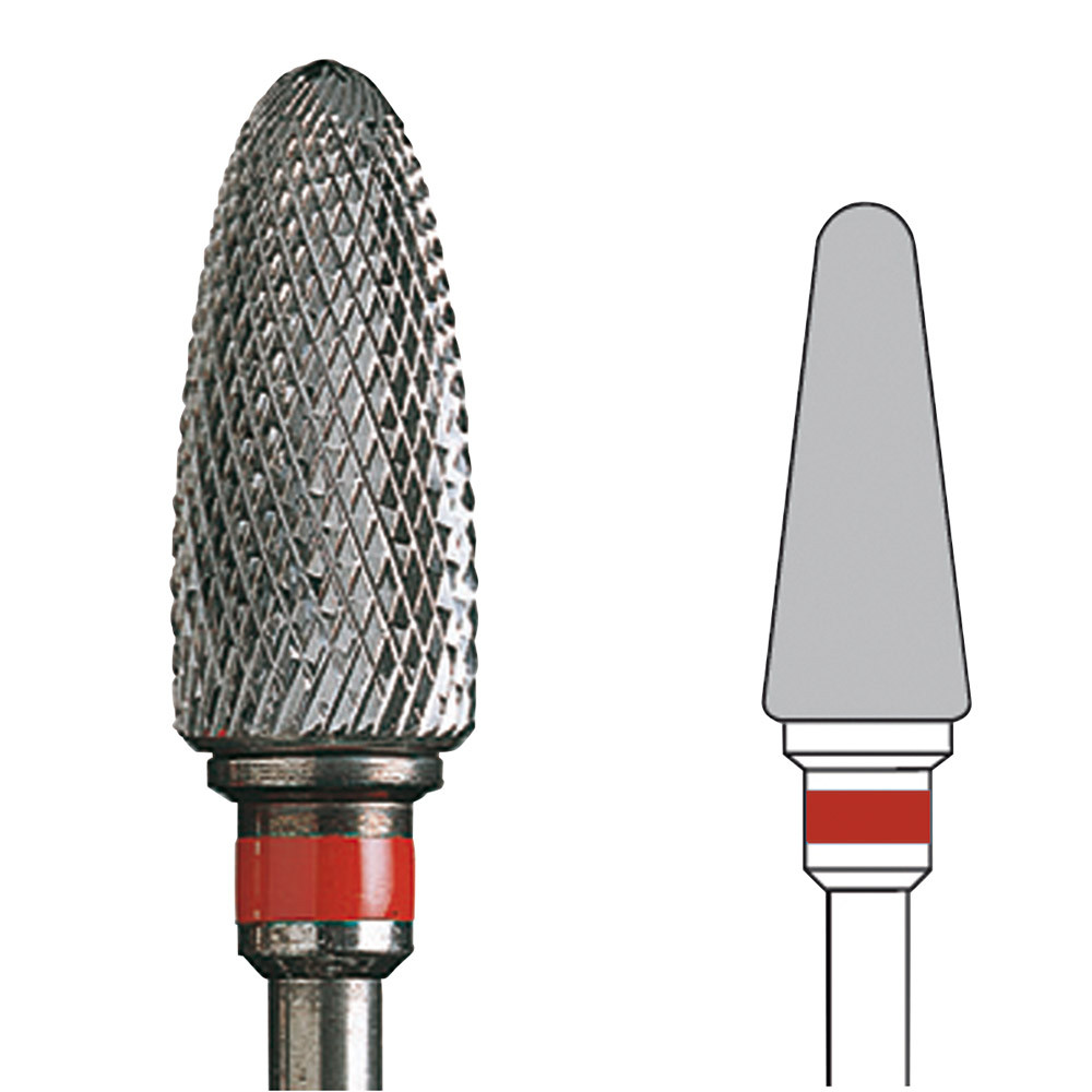Hartmetallfräse, kreuzverzahnt, birnenförmig. Anwendung: Zum Einschleifen von Aufbissschienen