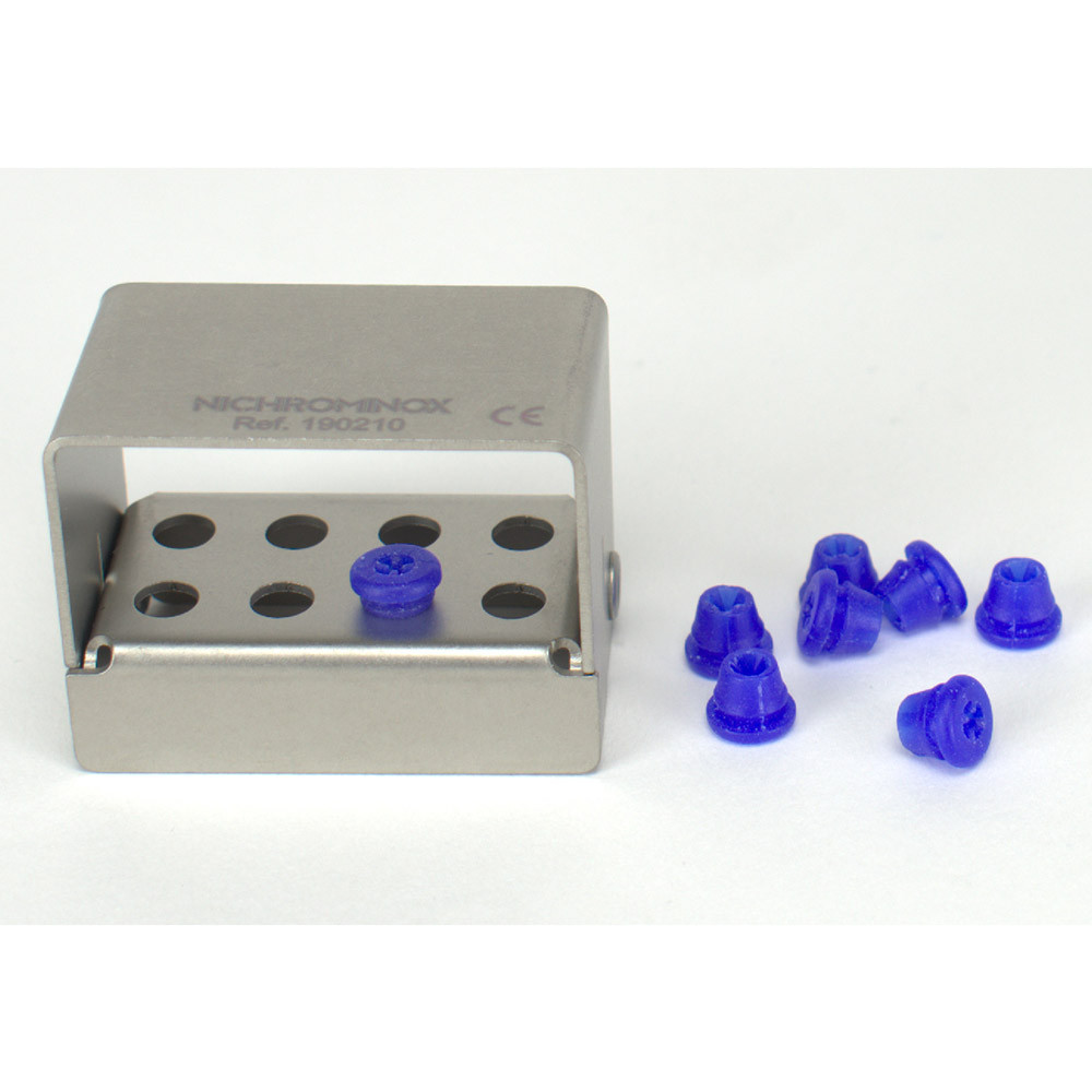 Bohrerständer aus Edelstahl. Aufklappbar, mit Silikonhaltern für FG und Winkelstück Instrumente verschiedener Durchmesser. Kann mit allen Desinfektions- und Reinigungslösungen sowie allen Sterilisationsverfahren eingesetzt werden.