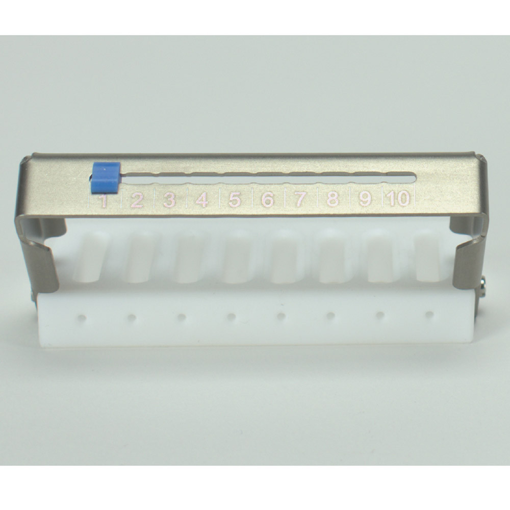 Im geöffneten Zustand stabiler Halter, der sowohl vertikal als auch horizontal gelagert werden kann. Die Oberseite rastet ein, um die Instrumente während des Prozesses sicher zu halten. Jede Einheit verfügt über einen eingebauten Silikon-Cursor zum Zählen der Häufigkeit, mit der die Instrumente verwendet und sterilisiert wurden. Unterstützt jede Art von Dekontamination und Sterilisation. Edelstahl und Teflon