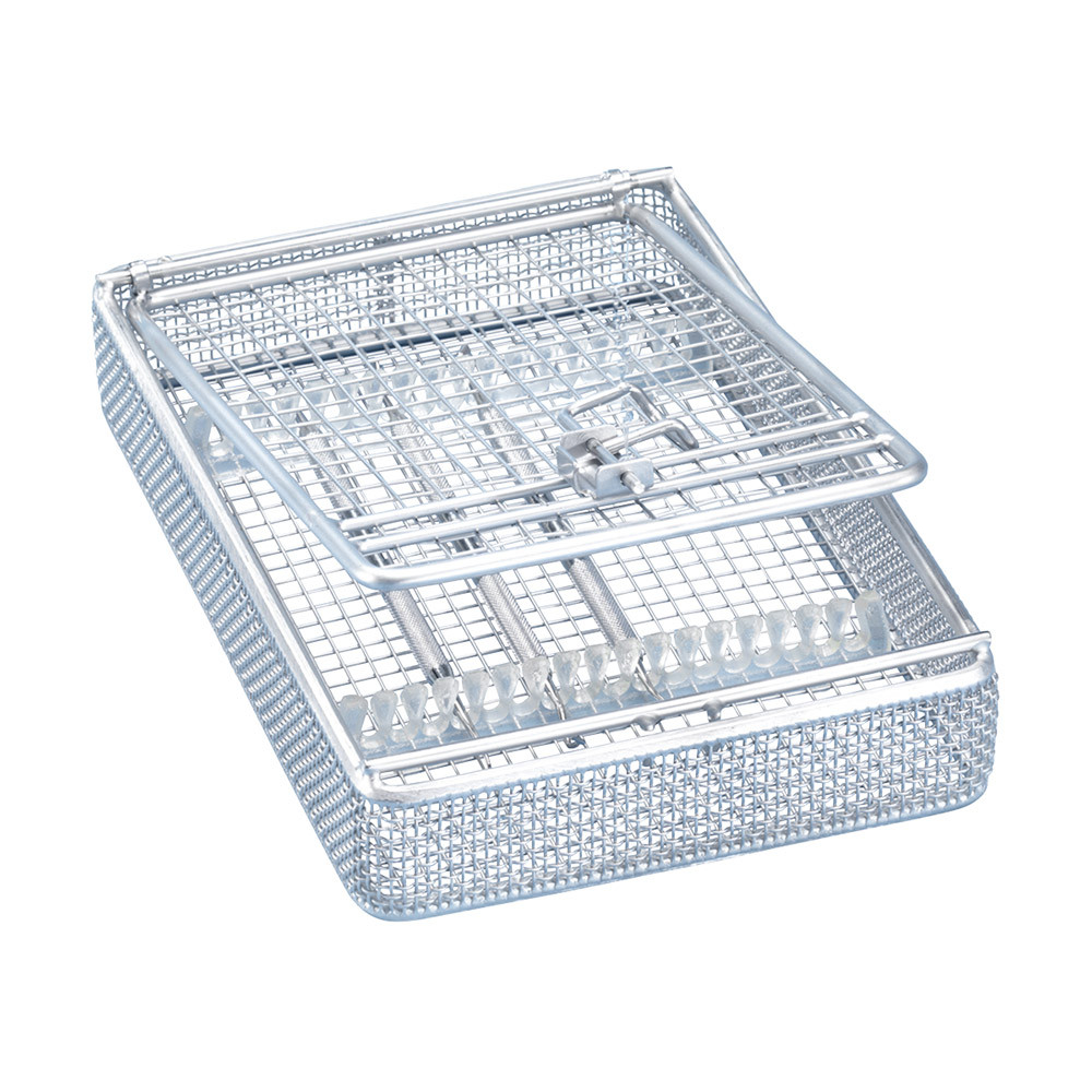Einsatz zur optimalen Aufnahme von diversem Instrumentarium. Maschenweite Boden 3 mm, Seiten 1,7 mm, Deckel 8 mm, Dampfsterilisierbar bei 121 °C/134 °C