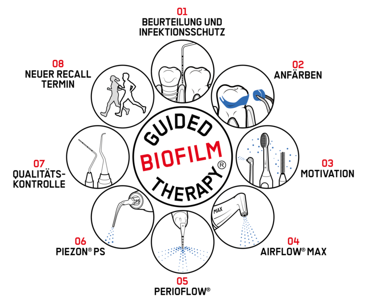 Die Guided Biofilm Therapy (GBT) ist der nächste Schritt in der modernen PZR. GBT vereint neueste wissenschaftliche Erkenntnisse mit technisch hochmodernen Instrumenten in einer ganzheitlichen dentalen Behandlung.